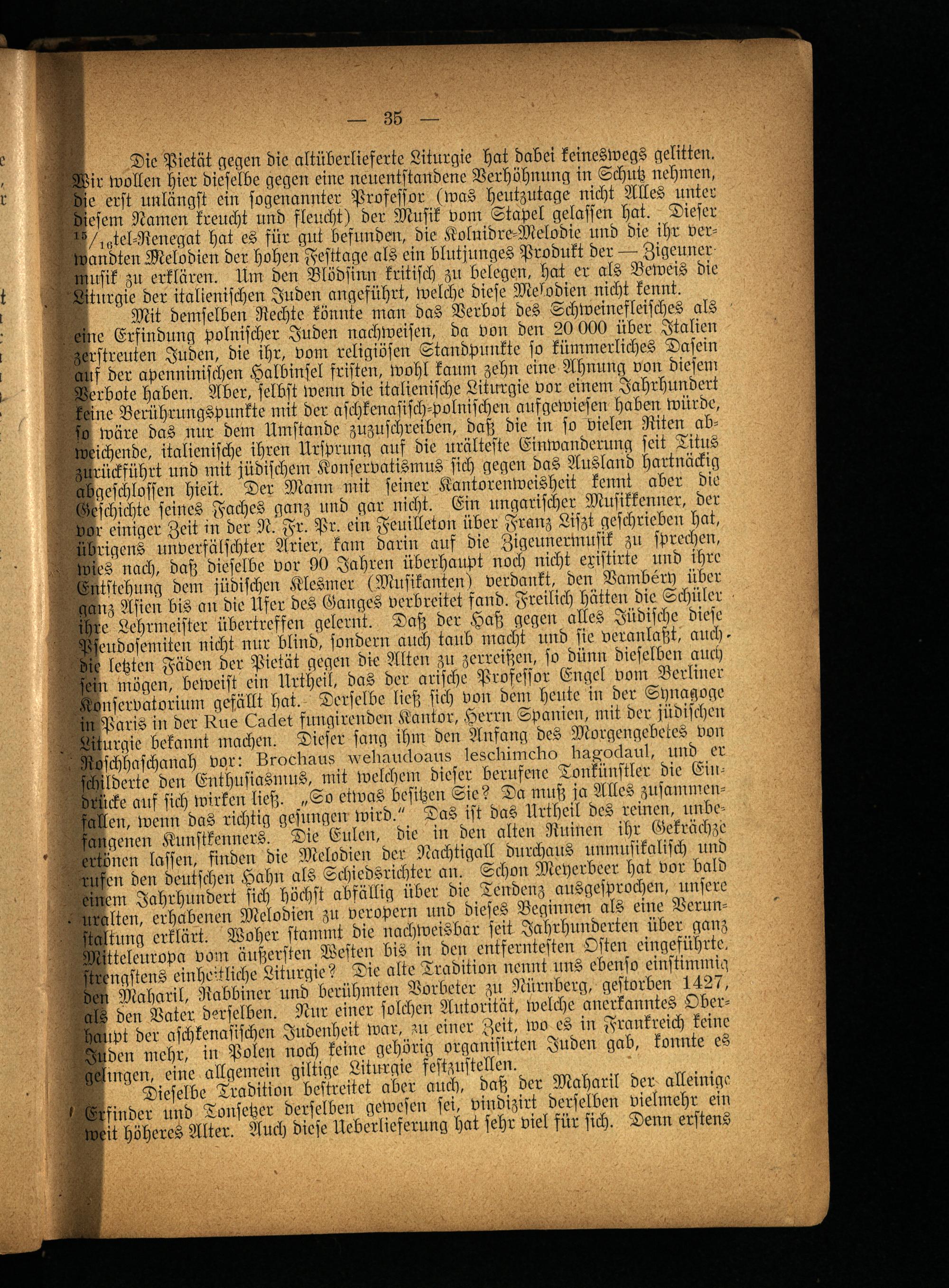die erst unlängst ein sogenannter Professor (was heutzutage nicht Alles unter diesem Namen kreucht und fleucht) der Musik vom Stapel gelassen hat. Dieser 15/16stel-Renegat hat es für gut befunden, die Kolnidre-Melodie und die ihr verwandten Melodien der hohen Festtage als ein blutjunges Produkt der — Zigeuner- musik zu erklären. Um den Blödsinn kritisch zu belegen, hat er als Beweis die Liturgie der italienischen Juden angeführt, welche diese Melodien nicht kennt.