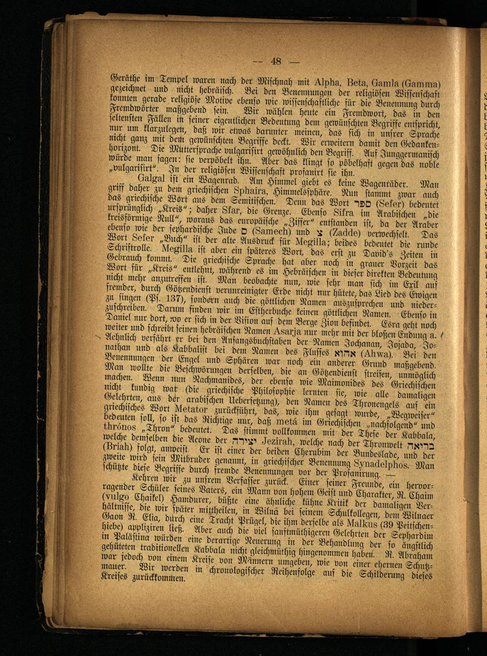 Kehren wir zu unsrem Verfasser zurück. Einer seiner Freunde, ein hervorragender Schüler seines Vaters, ein Mann von hohem Geist und Charakter, R. Chaiin (-vuiAO Chaikel) Hamdurer, büßte eine ähnliche kühne Kritik der damaligen Verhältnisse, die wir später mittheilen, in Wilna bei seinem Schulkollegen, dem Wilnaer Gaon R. Elia, durch eine Tracht Prügel, die ihm derselbe als Ukübm8 (39 Peitschenhiebe) appliziren ließ. Aber auch die viel sanftmüthigeren Gelehrten der Sephardim in Palästina würden eine derartige Neuerung in der Behandlung der so ängstlich gehüteten traditionellen Kabbala nicht gleichmüthig hingenommen haben. R. Abraham war jedoch von einem Kreise von Männern umgeben, wie von einer ehernen Schutzmauer. Wir werden in chronologischer Reihenfolge auf die Schilderung dieses Kreises zurückkommen.
