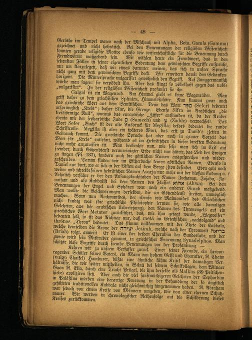 Gerüche im Tempel waren nach der Mischnah mit .-Bpim, Ilatu, Oumiu(Oummu) gezeichnet und nicht hebräisch. Bei den Benennungen der religiösen Wissenschaft konnten gerade religiöse Motive ebenso wie wissenschaftliche für die Benennung durch Fremdwörter maßgebend sein. Wir wühlen heute ein Fremdwort, das in den seltensten Fällen in seiner eigentlichen Bedeutung dem gewünschten Begriffe entspricht, nur um klarzulegen, daß wir etwas darunter meinen, das sich in unsrer Sprache nicht ganz mit dem gewünschten Begriffe deckt. Wir erweitern damit den Gedanken- Horizont. Die Muttersprache vulgarisirt gewöhnlich den Begriff. Auf Junggermanisch Würde man sagen: sie verpöbelt ihn. Aber das klingt so pöbelhaft gegen das noble „vulgarisirt". In der religiösen Wissenschaft profanirt sie ihn.