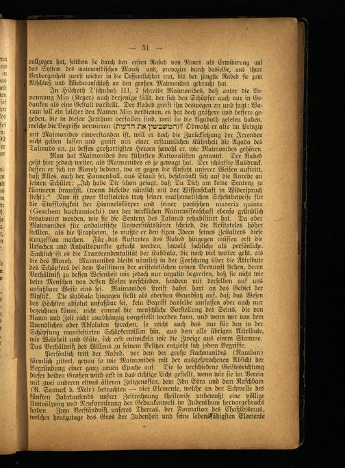 Persönlich tritt der Rabed, vor dem der große Nachmanides (Ramban) förmlich zittert, genau so wie Maimonides mit der ausgesprochenen Absicht der Begründung einer ganz neuen Epoche auf. Die so verschiedene Geistesrichtung dieser beiden Großen wird erst in das richtige Licht gestellt, wenn wir sie im Verein mit zwei anderen etwas älteren Zeitgenossen, dem Jbn Esra und dem Raschbam (R. Samuel b. Meir) betrachten — vier Elemente, welche an der Schwelle des fünfteil Jahrtausends unsrer Zeitrechnung theilweise unbewußt eine völlige Umwälzung und Neuformirung der Gedankenwelt im Judenthum hervorgebracht haben. Zum Verständniß unseres Themas, der Formation des Chaßidismus, welcher heutzutage das Gros der Judenheit und seine lebensfähigsten Elemente