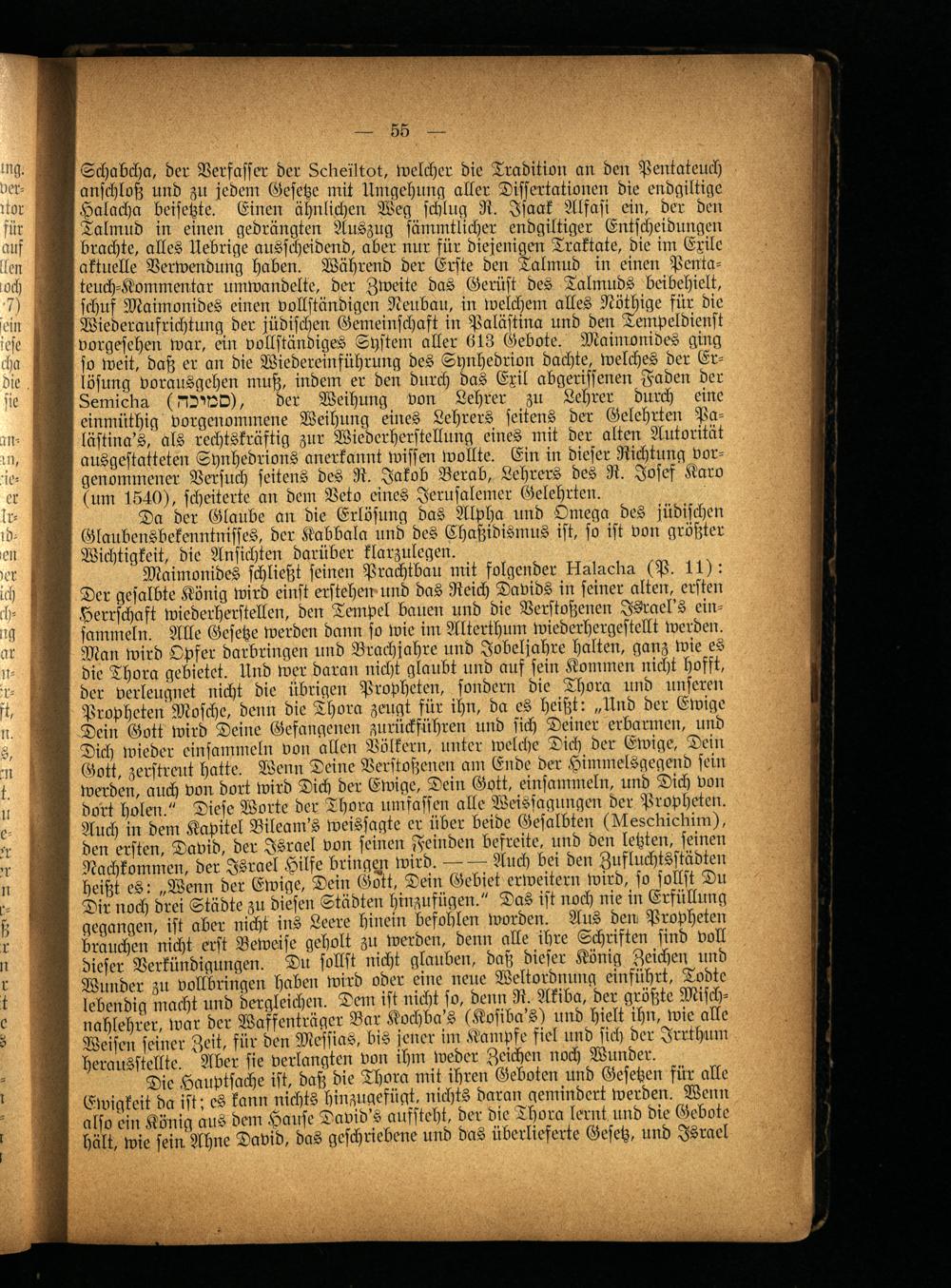 Maimonides schließt seinen Prachtbau mit folgender Halaclla (P. 11): Der gesalbte König wird einst erstehen und das Reich Davids in seiner alten, ersten Herrschaft wiederherstellen, den Tempel bauen und die Verstoßenen Jsrael's einsammeln. Alle Gesetze werden dann so wie im Alterthum wiederhcrgestellt werden. Man wird Opfer darbringen und Brachjahre und Jobeljahre halten, ganz wie es die Thora gebietet. Und wer daran nicht glaubt und auf sein Kommen nicht hofft, der verleugnet nicht die übrigen Propheten, sondern die Thora und unseren Propheten Mosche, denn die Thora zeugt für ihn, da es heißt: „Und der Ewige Dein Gott wird Deine Gefangenen zurücksühren und sich Deiner erbarmen, und Dich wieder einsammeln von allen Völkern, unter welche Dich der Ewige, Dein Gott, zerstreut hatte. Wenn Deine Verstoßenen am Eude der Himmelsgegend sein werden, auch von dort wird Dich der Ewige, Dein Gott, einsammeln, und Dich von dort holen." Diese Worte der Thora umfassen alle Weissagungen der Propheten. Auch in dem Kapitel Bileam's weissagte er über beide Gesalbten (Nesclliclüm), den ersten, David, der Israel von seinen Feinden befreite, und den letzten, seinen