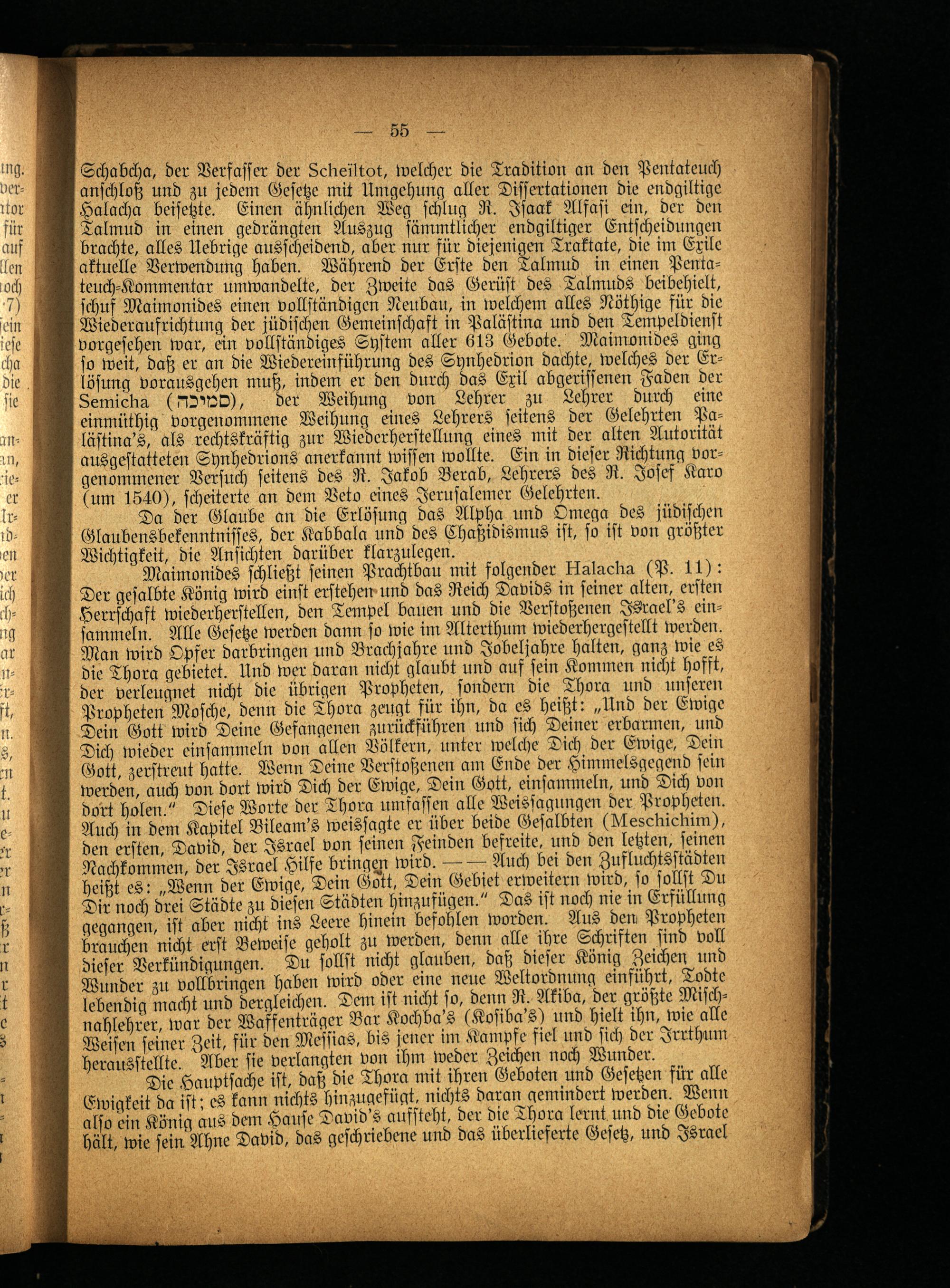 Schabcha, der Verfasser der Lclleiltot, welcher die Traditio:: an den Pentateuch anschloß und zu jedem Gesetze mit Umgehung aller Dissertationen die endgiltigc Halacha beisetzte. Einen ähnlichen Weg schlug R. Isaak Alfasi ein, der den Talmud in einen gedrängten Auszug sämmtlicher endgilttger Entscheidungen brachte, alles Uebrige ausscheidend, aber nur für diejenigen Traktate, die im Exile aktuelle Verwendung haben. Während der Erste den Talmud in einen Pentateuch-Kommentar umwandelte, der Zweite das Gerüst des Talmuds beibehielt, schuf Maimonides einen vollständigen Neubau, in welchem alles Nöthige für die Wiederaufrichtung der jüdischen Gemeinschaft in Palästina und den Tempeldienst vorgesehen war, ein vollständiges System aller 613 Gebote. Maimonides ging so weit, daß er an die Wiedereinführung des Synhedrion dachte, welches der Erlösung vorausgehen muß, indem er den durch das Exil abgerissenen Faden der Zemiclm (N^VO), der Weihung von Lehrer zu Lehrer durch eine einmüthig vorgenommene Weihung eines Lehrers seitens der Gelehrten Pa- lästina's, als rechtskräftig zur Wiederherstellung eines mit der alten Autorität ausgestatteten Synhedrions anerkannt wissen wollte. Ein in dieser Richtung vorgenommener Versuch seitens des R. Jakob Berab, Lehrers des R. Josef Karo (um 1640), scheiterte an dem Veto eines Jerusalemer Gelehrten.