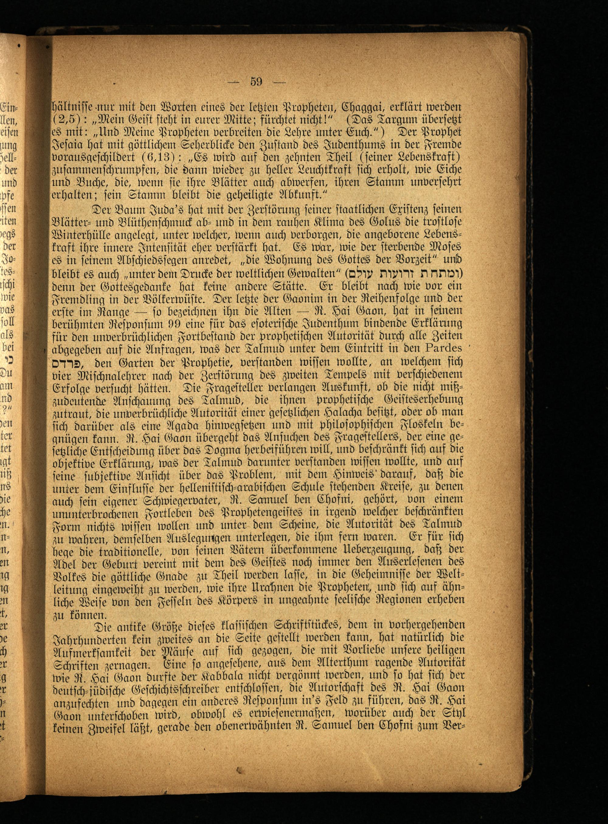 Die antike Größe dieses klassischen Schriftstückes, den: in vorhergehenden Jahrhunderten kein zweites an die Seite gestellt werden kann, hat natürlich die Aufmerksamkeit der Mäuse auf sich gezogen, die mit Vorliebe unsere heiligen Schriften zernagen. Eine so angesehene, aus den: Alterthum ragende Autorität wie R. Hai Gaon durfte der Kabbala nicht vergönnt werden, und so hat sich der deutsch-jüdische Geschichtsschreiber entschlossen, die Autorschaft des R. Hai Gaon anzufcchten und dagegen ein anderes Responsum in's Feld zu führen, das R. Hai Gaon unterschoben wird, obwohl es erwiesenermaßen, worüber auch der Styl keinen Zweifel läßt, gerade den obenerwähnten R. Samuel ben Chofni zum Ver-