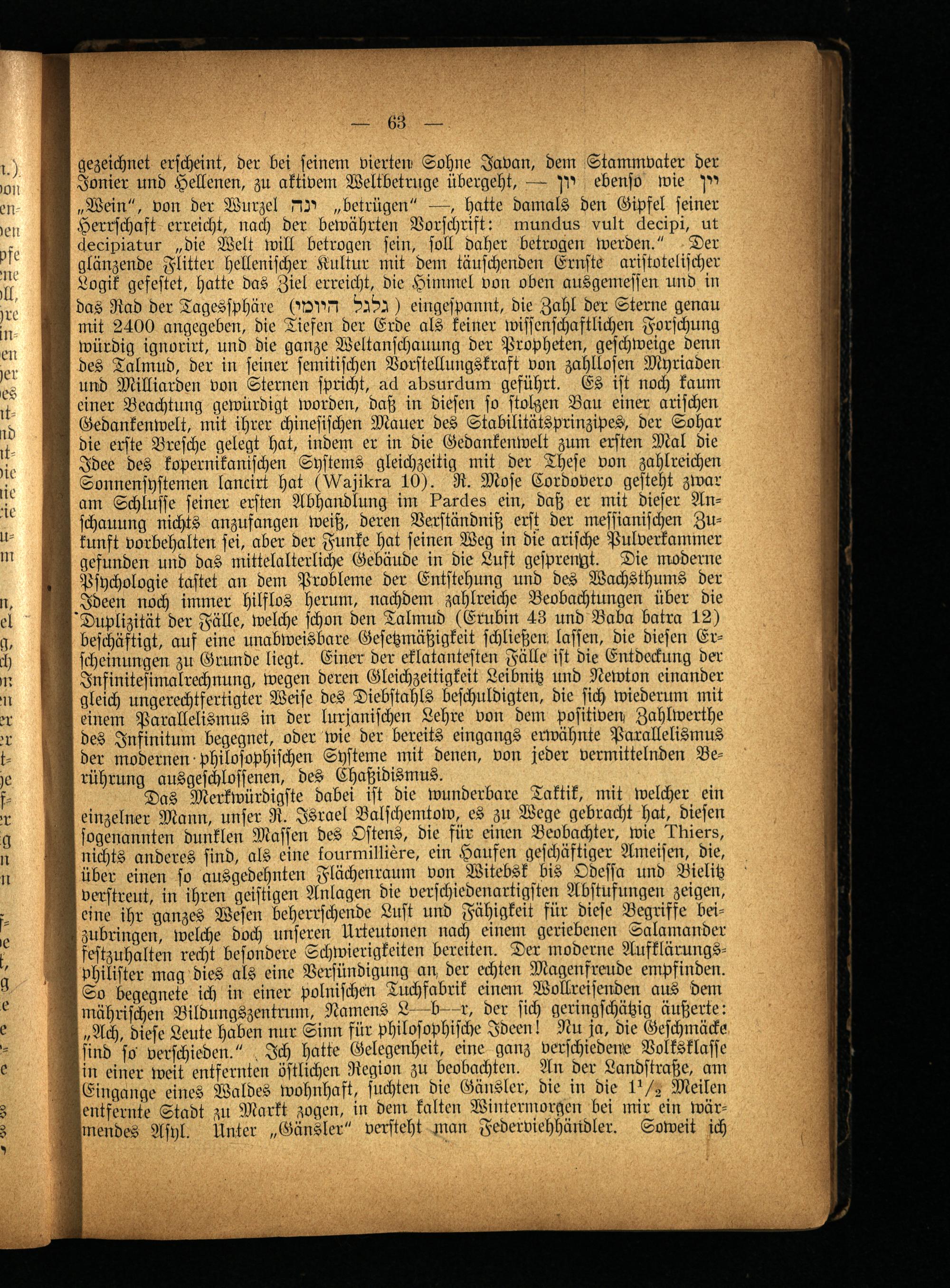 Das Merkwürdigste dabei ist die wunderbare Taktik, mit welcher ein einzelner Mann, unser R. Israel Balschemtow, es zu Wege gebracht hat, diesen sogenannten dunklen Massen des Ostens, die für einen Beobachter, wie Diners, nichts anderes sind, als eine tourmilliere, ein Haufen geschäftiger Ameisen, die, über einen so ausgedehnten Flächenraum von Witebsk bis Odessa und Bielitz verstreut, in ihren geistigen Anlagen die verschiedenartigsten Abstufungen zeigen, eine ihr ganzes Wesen beherrschende Lust und Fähigkeit für diese Begriffe bei- zubringen, welche doch unseren Urteutonen nach einem geriebenen Salamander festzuhalten recht besondere Schwierigkeiten bereiten. Der moderne Aufklärungs- Philister mag dies als eine Versündigung an, der echten Magenfreude empfinden. So begegnete ich in einer polnischen Tuchfabrik einem Wollreisenden aus dem mährischen Bildungszentrum, Namens L—b—r, der sich geringschätzig äußerte: „Ach, diese Leute haben nur Sinn für philosophische Ideen! Nu ja, die Geschmäcke sind so verschieden." Ich hatte Gelegenheit, eine ganz verschiedene Volksklasse in einer weit entfernten östlichen Region zu beobachten. An der Landstraße, am Eingänge eines Waldes wohnhaft, suchten die Gänsler, die in die IV» Meilen entfernte Stadt zu Markt zogen, in den: kalten Wintermorgen Lei mir ein wärmendes Asyl. Unter „Gänsler" versteht man Federviehhändler. Soweit ich