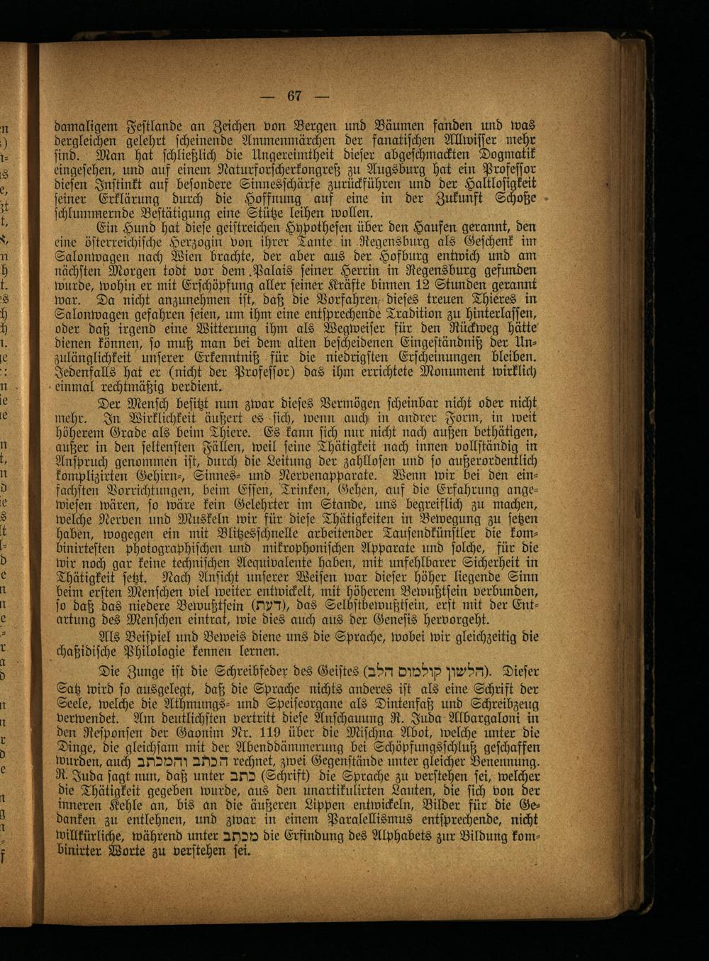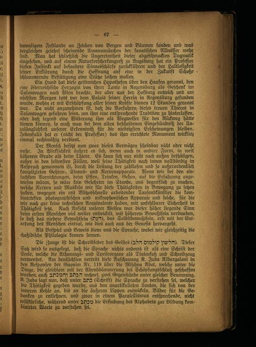 Sah wird so ausgelegt, daß die Sprache nichts anderes ist als eine Schrift der Seele, welche die Athmungs- und Speiseorgane als Tintenfaß und Schreibzeug verwendet. Am deutlichsten vertritt diese Anschauung R. Juda Albargaloni in den Refponsen der Gaonim Nr. 119 über die Mischna Abot, welche unter die Dinge, die gleichsam mit der Abenddämmerung bei Schöpfungsschluß geschaffen wurden, auch 2712V711 2N2N rechnet, zwei Gegenstände unter gleicher Benennung. R. Juda sagt nun, daß unter 27^2 (Schrift) die Sprache zu verstehen fei, welcher die Thätigkeit gegeben wurde, aus den unartikulirten Lauten, die sich von der inneren Kehle an, bis an die äußeren Lippen entwickeln, Bilder für die Gedanken zu entlehnen, und zwar in einem Paralellismus entsprechende, nicht willkürliche, während unter 2712V die Erfindung des Alphabets znr Bildung kom- binirter Worte zu verstehen sei.