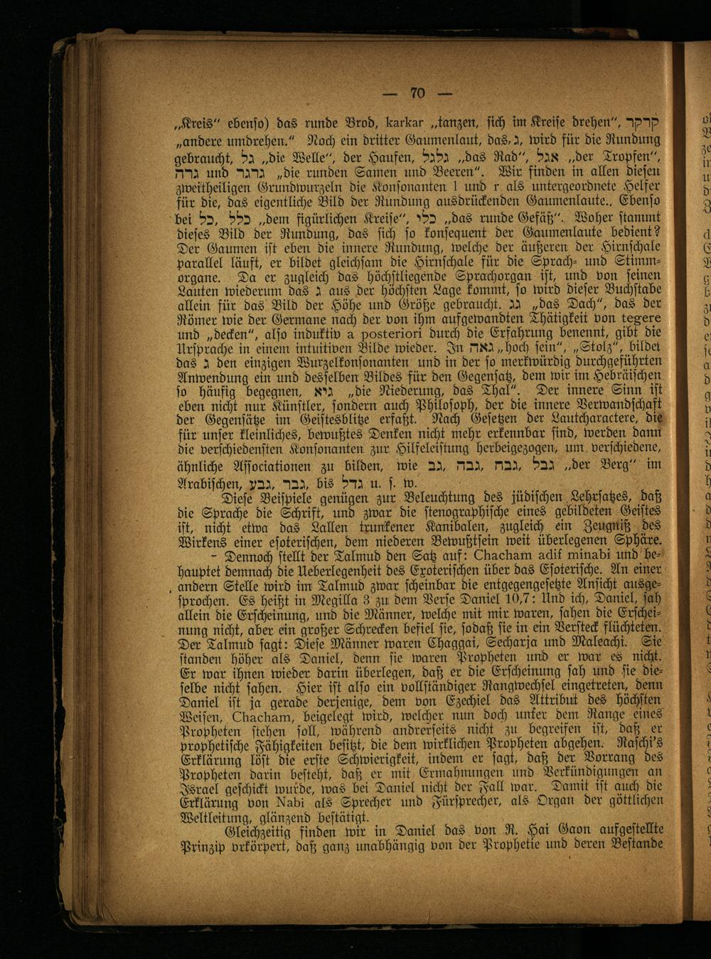 - Dennoch stellt der Talmud den Satz auf: Elmcbam aäit minadi und behauptet demnach die Ueberlegenheit des Exoterischen über das Esoterische. An einer andern Stelle wird im Talmud zwar scheinbar die entgegengesetzte Ansicht ausgesprochen. Es heißt in Megilla 3 zu dem Verse Daniel 10,7: Und ich, Daniel, sah allein die Erscheinung, und die Männer, welche mit mir waren, sahen die Erscheinung nicht, aber ein großer Schrecken befiel sie, sodaß sie in ein Versteck flüchteten. Der Talmud sagt: Diese Männer waren Chaggai, Secharja und Maleachi. Sie standen höher als Daniel, denn sie waren Propheten und er war es nicht. Er war ihnen wieder darin überlegen, daß er die Erscheinung sah und sie dieselbe nicht sahen. Hier ist also ein vollständiger Rangwechsel eingetreten, denn Daniel ist ja gerade derjenige, dem von Ezechiel das Attribut des höchsten Weisen, Ebaclmm, beigelegt 'wird, welcher nun doch unter dem Range eines Propheten stehen soll, während andrerseits nicht zu begreifen ist, daß er prophetische Fähigkeiten besitzt, die dem wirklichen Propheten abgehen. Raschi's Erklärung löst die erste Schwierigkeit, indem er sagt, daß der Vorrang des Propheten darin besteht, daß er mit Ermahnungen und Verkündigungen an Israel geschickt wurde, was bei Daniel nicht der Fall war. Damit ist auch die Erklärung von bladi als Sprecher und Fürsprecher, als Organ der göttlichen Weltleitung, glänzend bestätigt.
