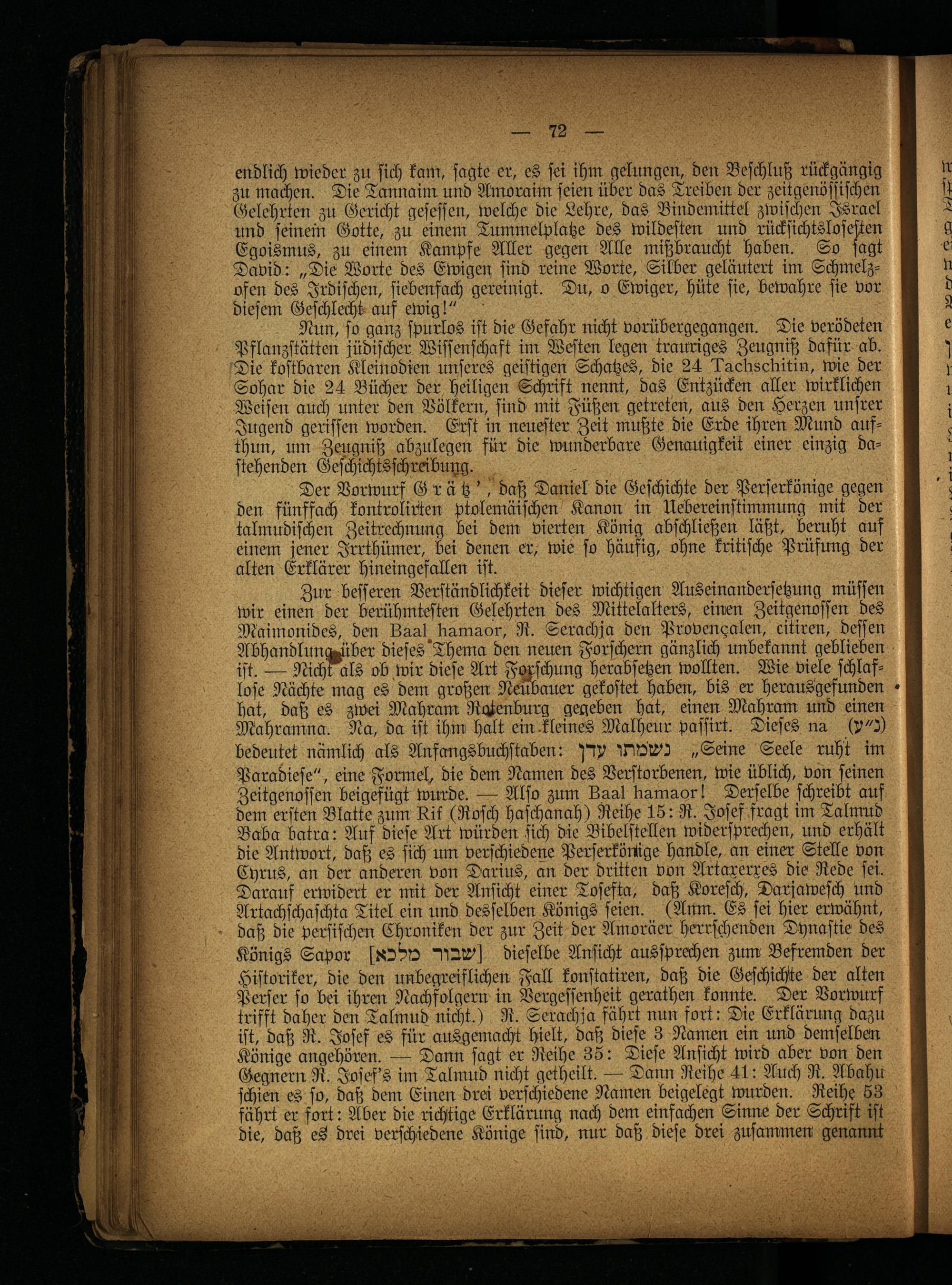 Paradiese", eine Formel, die dem Namen des Verstorbenen, wie üblich, von seinen Zeitgenossen beigefügt wurde. — Also zum Baal bamaor! Derselbe schreibt auf dem ersten Blatte zum ll.it (Rosch haschanah) Reihe 15: R. Josef fragt im Talmud Baba batra: Auf diese Art würden sich die Bibelstellen widersprechen, und erhält die Antwort, daß es sich um verschiedene Perserköniige handle, an einer Stelle von Cyrus, an der anderen von Darius, an der dritten von Artaxerres die Rede sei. Darauf erwidert er mit der Ansicht einer Tosefta, daß Koresch, Darjawesch und Artachschaschta Titel ein und desselben Königs seien. (Anm. Es sei hier erwähnt, daß die persischen Chroniken der zur Zeit der Amoräer herrschenden Dynastie des Königs Sapor dieselbe Ansicht aussprechen zum Befremden der