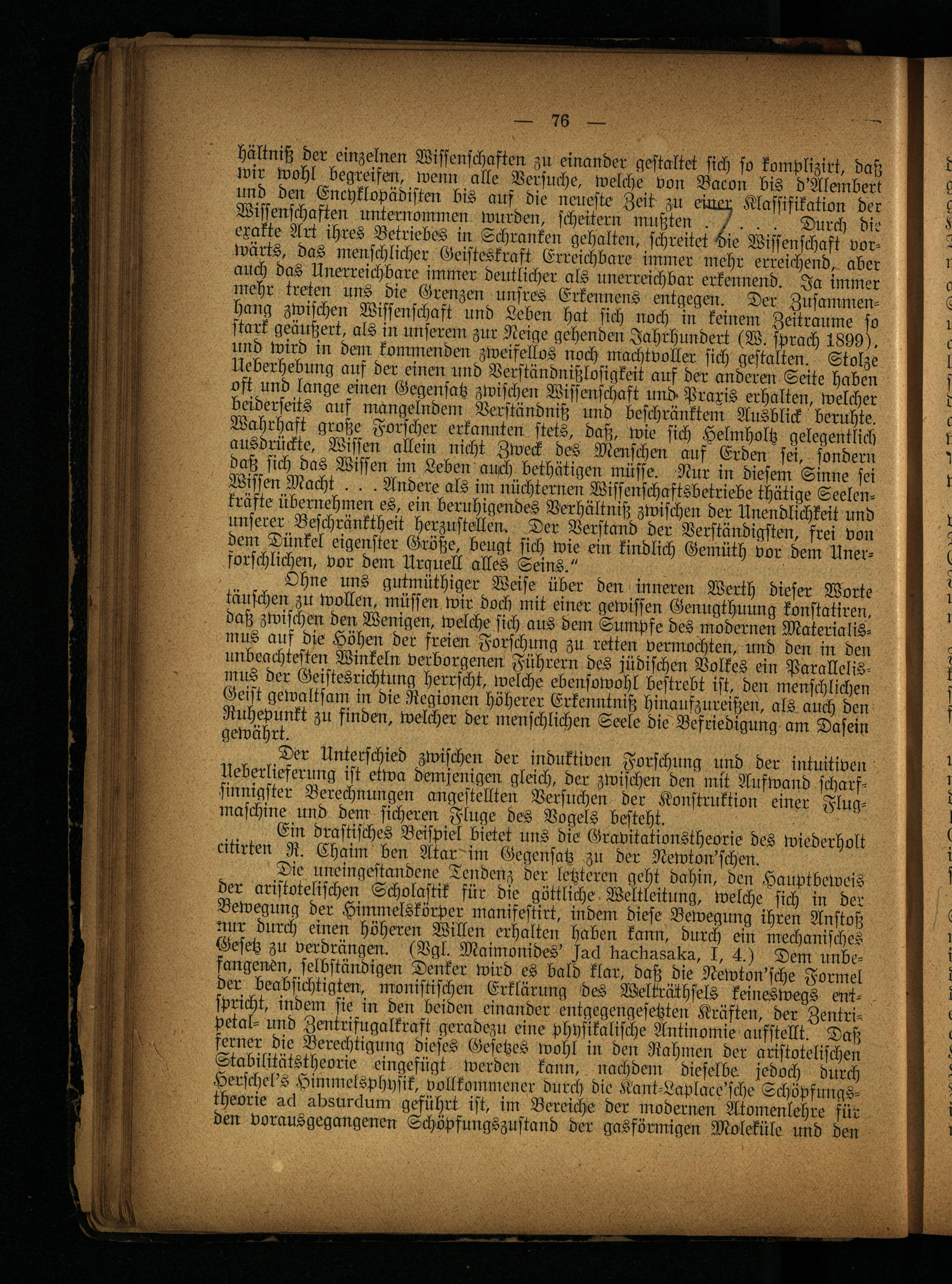 Ohne uns gutmüthiger Weise über den inneren Werth dieser Worte täuschen zu wollen, müssen wir doch mit einer gewissen Genugthuung konstatiren, daß zwischen den Wenigen, welche sich aus dem Sumpfe des modernen Materialismus auf die Höhen der freien Forschung zu retten vermochten, und den in den unbeachtesten Winkeln verborgenen Führern des jüdischen Volkes ein Parallelismus der Geistesrichtung herrscht, welche ebensowohl bestrebt ist, den menschlichen Geist gewaltsam in die Regionen höherer Erkenntniß hinaufzureißen, als auch den Ruhepunkt zu finden, welcher der menschlichen Seele die Befriedigung am Dasein gewährt.