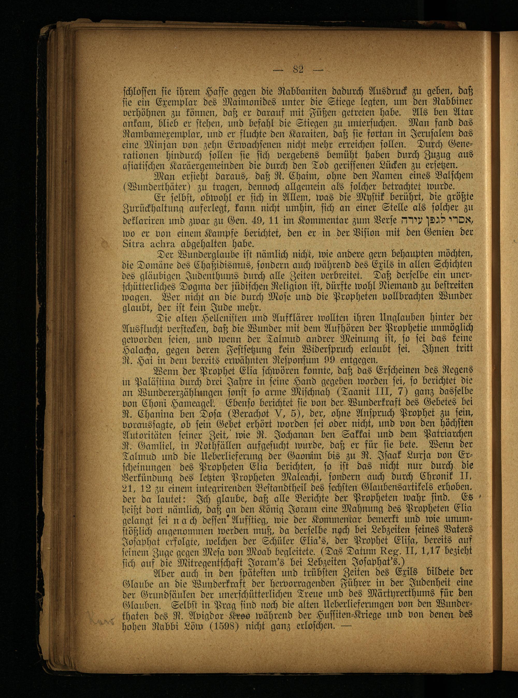 Er selbst, obwohl er sich in Allem, was die Mystik berührt, die größte Zurückhaltung auserlegt, kann nicht umhin, sich an einer Stelle als solcher zu deklarireu und zwar zu Gen. 49, 11 im Kommentar zum Verse NN'P '»ION, wo er von einem Kampfe berichtet, den er in der Vision mit den Genien der 3üra acllra abgehalten habe.