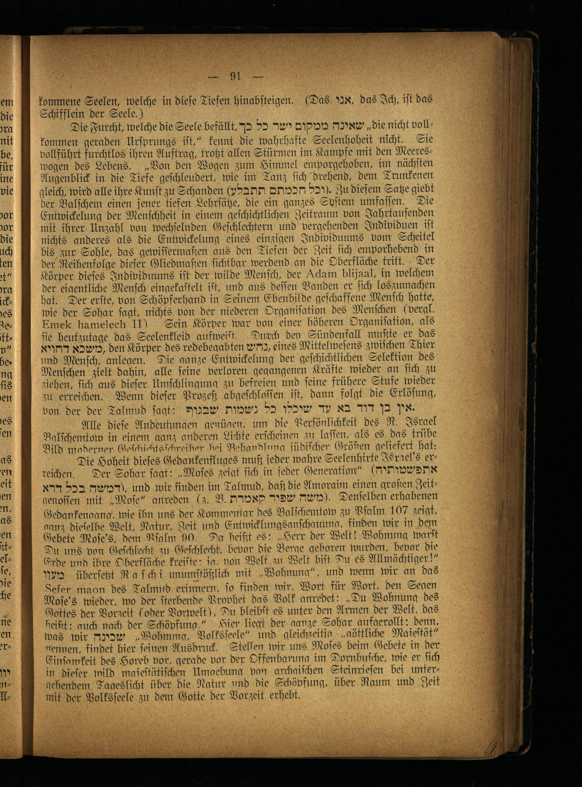 genossen mit „Mose" anredcn (z. B. VDVXP Nld'v). Denselben erhabenen Gedankenaana, wie ibn uns der Kommentar des Balschemtow zu Psalm 107 zeigt, oanz dieselbe Welt, Natur, Zeit und Entwicklungsanschauuna. finden wir in dm: Gebete Mose's, dem Vsglm 60. Da beißt es: ..Herr der Welt! Wohnung waiU Du uns von Geschlecht zu Geschlecht, bevor die Beine geboren wurden, bevor die Erde und ibre Oberfläche kreifie: ia. von Welt zu Welt bift Du es Allmächtiger!" ZVV übersetzt Raschi unumstößlich mit „Wohnung", und wenn wir an das Tatar maon des Talmud erinnem, so finden wir. Wort für Wort, den Seaen Mose's wieder, wo der sterbende Provhet das Volk anredet: „Du Wohnung des Gottes der Vorzeit (oder Vorwelt), Du bleibst es unter den Arnnen der Welt, das beißt: auch nach der Schöpfung." Hier liegt der aanze Sohar aufaerollt: denn, was wir N^2tV „Wohnung, Volksseele" und gleichzeitig „göttliche Maiefiät" nennen, findet hier feinen Ansdruck. Stellen wir uns Moses beim Gebete in der Einsamkeit des Horeb vor. gerade vor der Offenbarung im Dornbüsche, wie er sich in dieser wild majestätischen Umgebung von archaischen Stcinriescn bei unter- gebendcm Tageslicht über die Natur und die Schöpfung, über Raum und Zeit mit der Volksseele zu dein Gotte der Vorzeit erhebt.