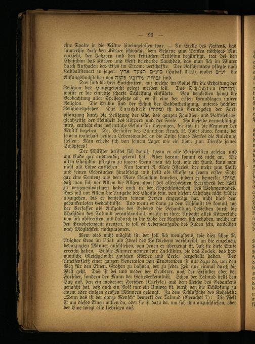 pflanzung durch die Heiligung der Ehe, des ganzen Familien- und Volkslebens, gleichzeitig der Reinheit des Körpers und der Seele. Wo dieselbe vernachlässigt wird, entsteht eine wesentliche Gefahr für diejenigen, die sich in die Regionen der Mystik begeben. Der Verfasser des Schulchan Aruch, N. Josef Karo, konnte bei seinein wahrhaft heiligen Lebenswandel an die Spitze seines Werkes die Anleitung stellen: Man erhebe sich von seinem Lager wie ein Löwe zum Dienste seines Schöpfers!