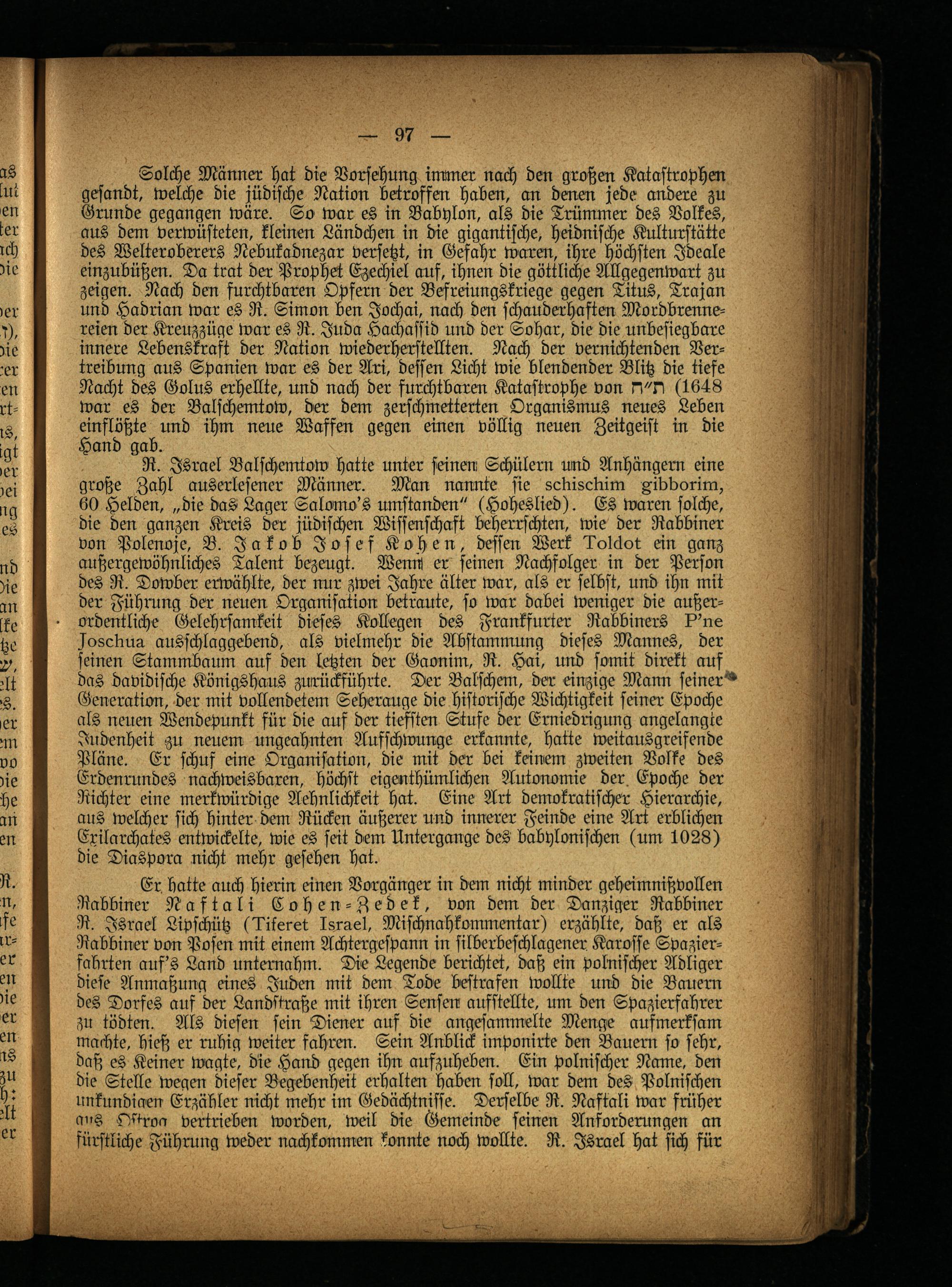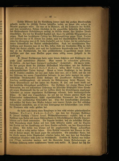Solche Männer hat die Vorsehung immer nach dm großen Katastrophen gesandt, welche die jüdische Nation betroffen haben, an denen jede andere zu Grunde gegangen wäre. So war es in Babylon, als die Trümmer des Volkes, aus dem verwüsteten, klemm Ländchen in die gigantische, heidnische Kulturstätte des Welteroberers Nebukadnezar versetzt, in Gefahr warm, ihre höchsten Ideale einzubüßen. Da trat der Prophet Ezechiel auf, ihnen die göttliche Allgegenwart zu zeigen. Nach dm furchtbaren Opfern der Befreiungskriege gegm Titus, Trajan und Hadrian war es R. Simon ben Jochai, nach dm schauderhaften Mordbrennereien der Kreuzzüge war es R. Juda Hachassid und der Sohar, die die unbesiegbare innere Lebenskraft der Nation wiederherstellten. Nach dm vernichtenden Vertreibung aus Spanien war es der Ari, dessen Licht wie blendender Blitz die tiefe Nacht des Golus erhellte, und nach der furchtbarm Katastrophe von N"N (1648 war es der Balschemtow, der dem zerschmetterten Organismus neues Leben einslößte und ihm nme Waffen gegen einen völlig neuen Zeitgeist in die Hand gab.