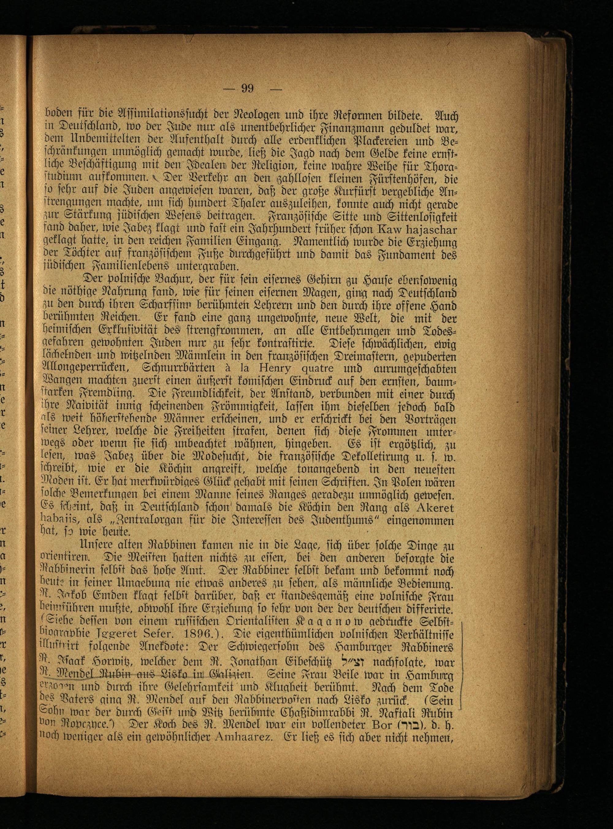 Unsere alten Rabbinen kamen nie in die Lage, sich über solche Dinge zu orientiren. Die Meisten hatten nichts zu essen, bei den anderen besorgte die Rabbinerin selbst das hohe Amt. Der Rabbiner selbst bekam und bekommt noch beut? in seiner Umgebung nie etwas anderes zu sehen, als männliche Bedienung. R. Jakob Emden klagt selbst darüber, daß er standesgemäß eine polnische Frau heinllühren mußte, obwohl ihre Erziehung so sehr von der der deutschen difserirte. sSiehe dessen von einem russischen Orientalisten Kaganow gedruckte Selbst- choaravbie leeret Leier. 1896.). Die eigentbümlichen volnischen Verhältnisse illnstisii folgende Anekdote: Der Schwiegersohn des Hamburger Rabbiners M Isaak Horwitz, welcher dein R. Jonathan Eibeschütz nachfolgte, war