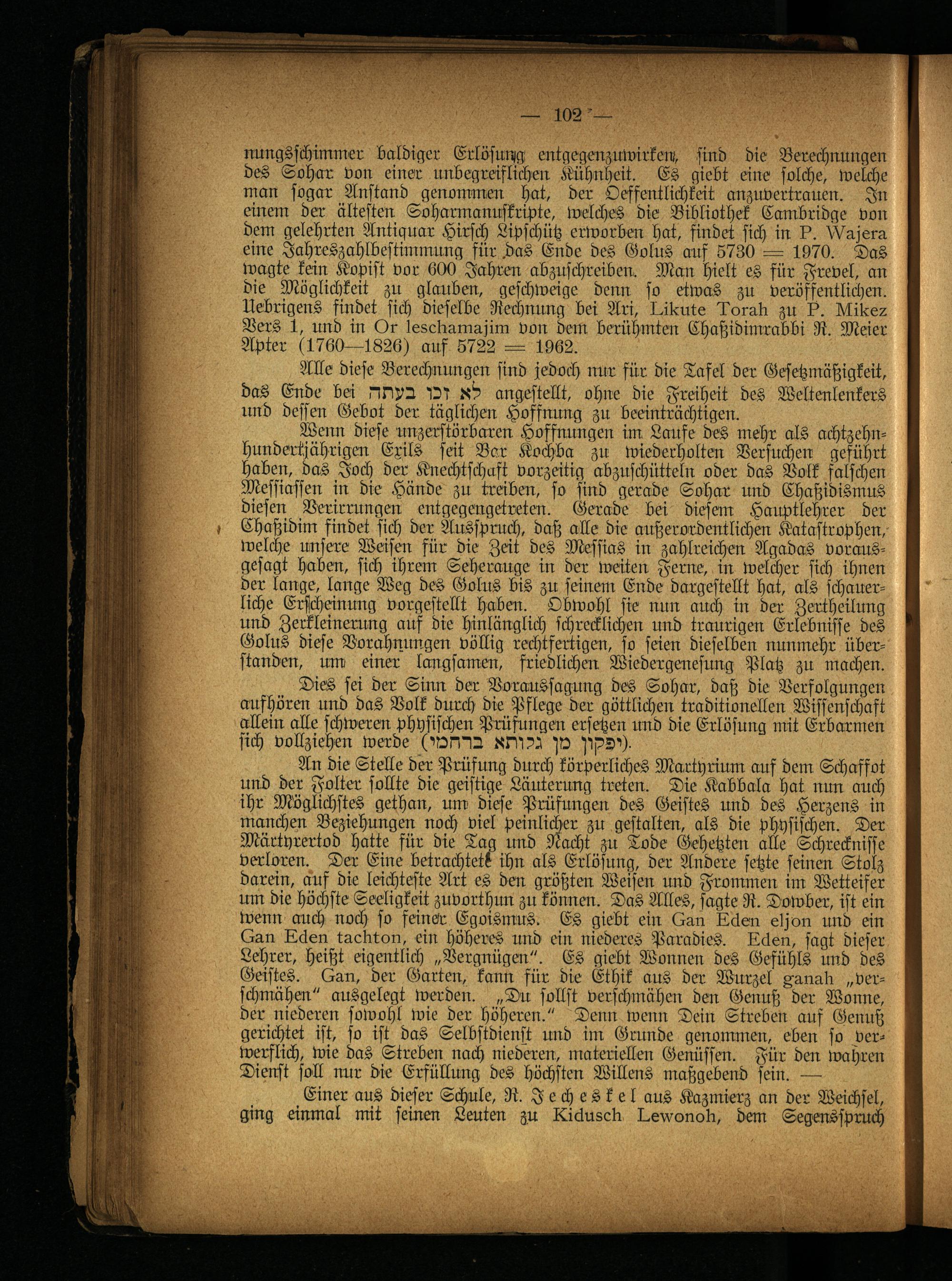 nungsschimmer baldiger Erlösunig entgegenzuwirken, sind die Berechnungen des Sohar von einer unbegreiflichen Kühnheit. Es giebt eine solche, welche man sogar Anstand genommen hat, der Oeffentlichkeit anzuvertrauen. In einem der ältesten Soharmanuskripte, welches die Bibliothek Cambridge von dem gelehrten Antiquar Hirsch Lipschütz erworben hat, findet sich in ?. ^Vajera eine Jahreszahlbestimmung für.das Ende des Golus aus 5730 — 1970. Das wagte kein Kopist vor 600 Jahren abzuschreiben. Man hielt es für Frevel, an die Möglichkeit zu glauben, geschweige denn so etwas zu veröffentlichen. Uebrigens findet sich dieselbe Rechnung bei Ari, Uwe Vorab zu ?. Llike? Vers 1, und in Or Ie8cbainajiin von dem berühmten Chaßidimrabbi R. Meier Apter (1760—1826) auf 6722 1962.