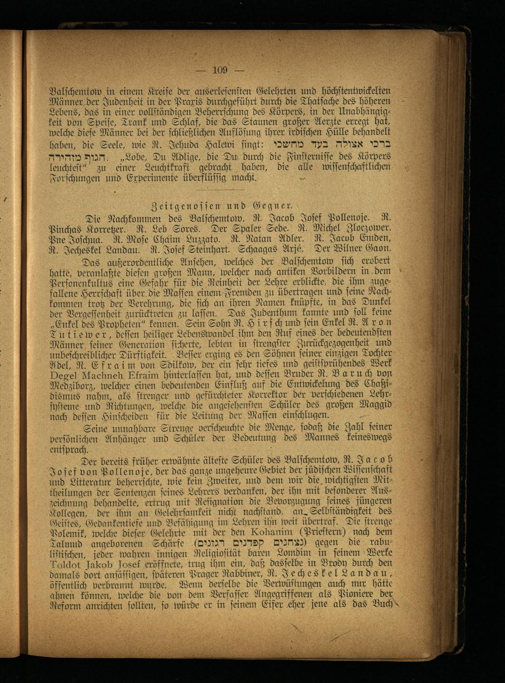 Der bereits früher erwähnte älteste Schüler des Balschemtow, R. Jacob Josef von Pollenoje, der das ganze ungeheure Gebiet der jüdischen Wissenschaft und Litteratur beherrschte, wie kein Zweiter, und dem wir die. wichtigsten Mit- theilungcn der Sentenzen seines Lehrers verdanken, der ihn mit besonderer Auszeichnung behandelte, ertrug mit Resignation die Bevorzugung seines jüngeren Kollegen, der ihm an Gelehrsamkeit nicht nachstaud, an. Selbständigkeit des Geistes, Gedankentiefe Lind Befähigung im Lehren ihn weit iibertraf. Tie strenge Polemik, welche dieser Gelehrte mit der den Lobanim (Priestern) nach dem Talmud angeborenen Schärfe gegen die rabn-