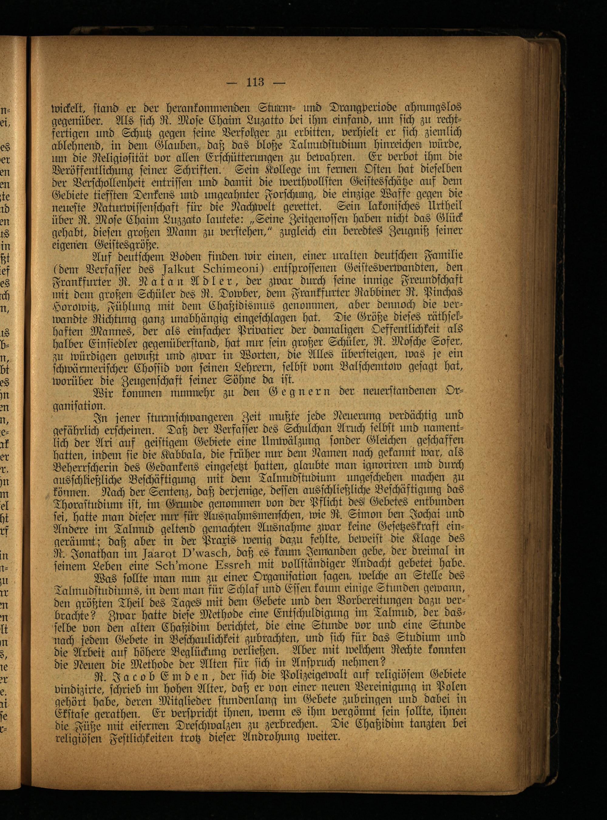 tvickelt. stand er der herankommenden Sturm- und Drangperiode ahnungslos gegenüber. Als sich R. Mose Chaim Luzatto bei ihm einfand, um sich zu recht- fertigen und Schutz gegen seine Verfolger zu erbitten, verhielt er sich ziemlich ablehnend, in dem Glauben,, daß das bloße Talmudstudium hinreichen würde, mn die Religiosität vor allen Erschütterungen zu bewahren. Er verbot ihm die Veröffentlichung seiner Schriften. Sein Kollege im fernen Osten hat dieselben der Verschollenheit entrissen und damit die werthvollsten Geistesschätze auf dem Gebiete tiefsten Denkens und ungeahnter Forschung, die einzige Waffe gegen die neueste Näturwissenschaft für die Nachwelt gerettet. Sein lakonisches Urtheil über R. Mose Chaim Luzzaito lautete: „Seine Zeitgenossen haben nicht das Glück gehabt, diesen großen Mann zu verstehen," zugleich ein beredtes Zeugniß seiner eigenen Geistesgröße.