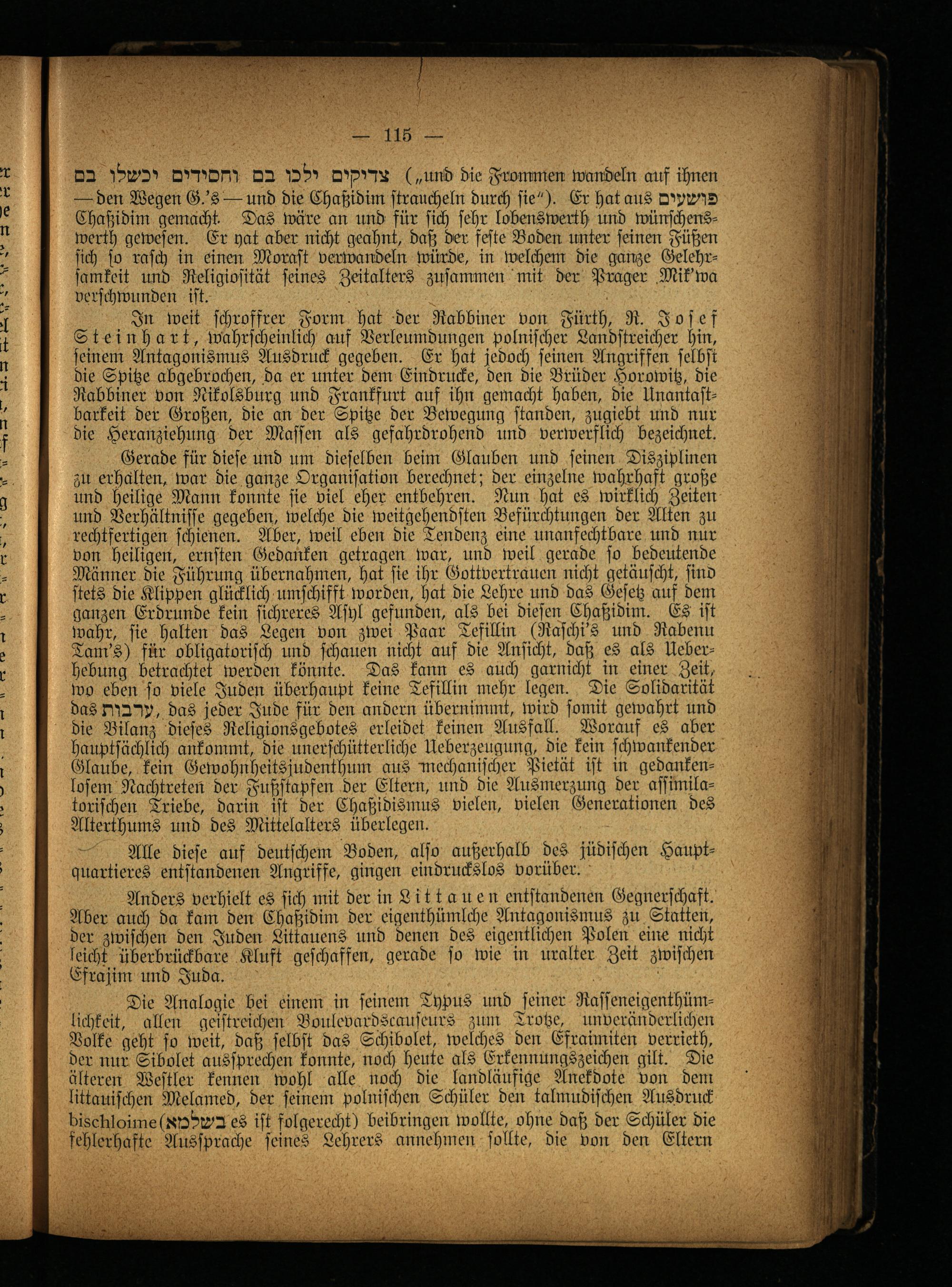 In weit schroffrer Form hat der Rabbiner von Fürth, R. Joses Steinhart, wahrscheinlich auf Verleumdungen polnischer Landstreicher hin, seinem Antagonismus Ausdruck gegeben. Er hat jedoch seinen Angriffen selbst die Spitze abgebrochen, da er unter dem Eindrücke, den die Brüder Horowitz, die Rabbiner von Nikolsburg und Frankfurt auf ihn gemacht haben, die Unantastbarkeit der Großen, die an der Spitze der Bewegung standen, zugiebt und nur die Heranziehung der Massen als gefahrdrohend und verwerflich bezeichnet.