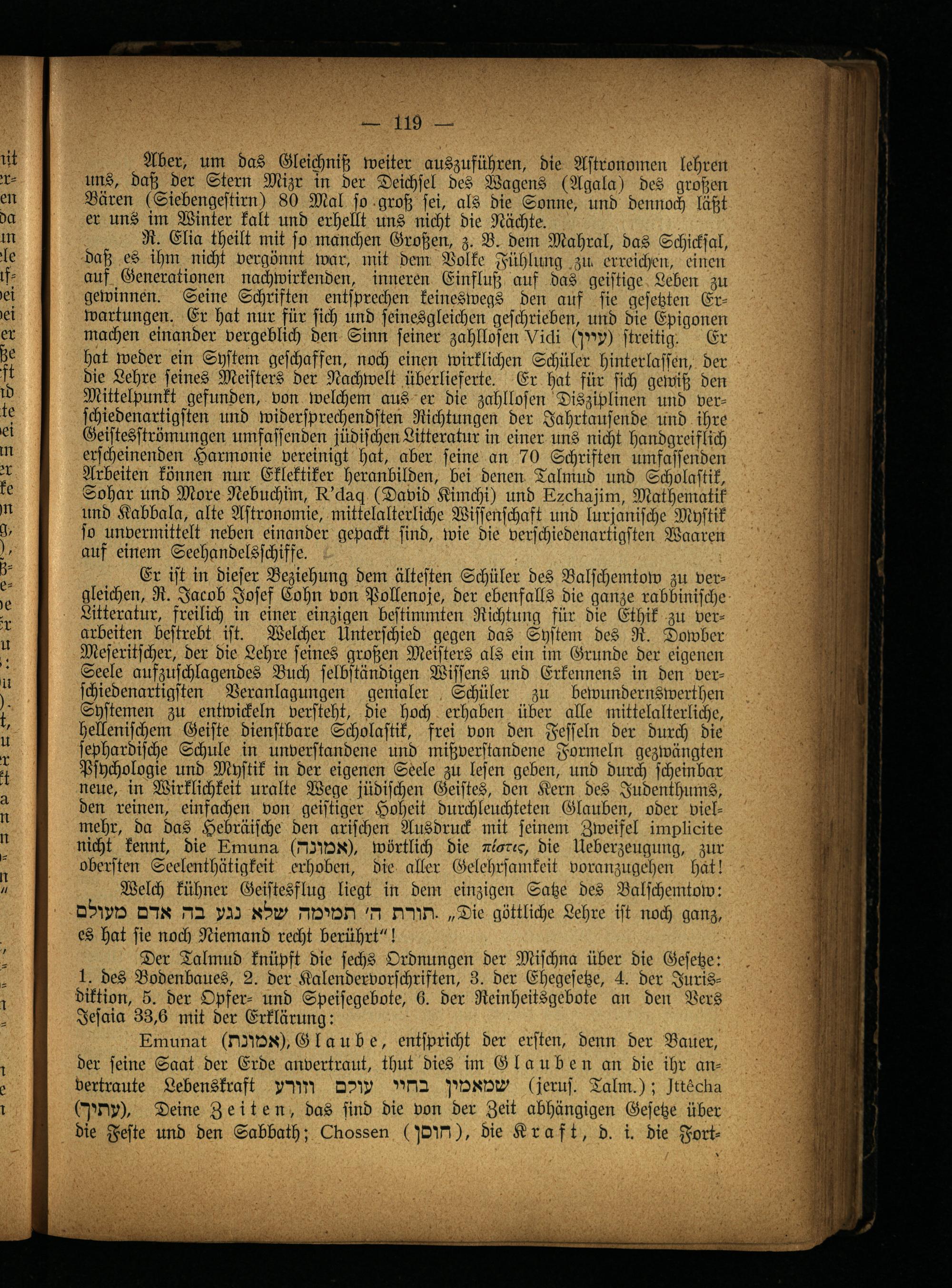 R. Elia theilt mit so manchen Großen, z. B. dem Mahral, das Schicksal, daß es ihm nicht vergönnt war, mit dein Volke Fühlung.zu erreichen, einen aus Generationen nachwirkenden, inneren Einfluß auf das geistige Leben zu gewinnen. Seine Schriften entsprechen keineswegs den auf sie gesetzten Erwartungen. Er hat nur für sich und seinesgleichen geschrieben, und die Epigonen machen einander vergeblich den Sinn seiner zahllosen Vicki streitig. Er hat weder ein System geschaffen, noch einen wirklichen Schüler hinterlassen, der die Lehre seines Meisters der Nachwelt überlieferte. Er hat für sich gewiß den Mittelpunkt gefunden, von welchem aus er die zahllosen Disziplinen und verschiedenartigsten und widersprechendsten Richtungen der Jahrtausende und ihre Geistesströmungen umfassenden silbischen Litteratur in einer uns nicht handgreiflich erscheinenden Harmonie vereinigt hat, aber seine an 70 Schriften umfassenden Arbeiten können nur Eklektiker heranbilden, bei denen Talmud und Scholastik, Sohar und More Nebuchrm, R.'ckgg (David Kimchi) und U^ellgsim, Mathematik und Kabbala, alte Astronomie, mittelalterliche Wissenschaft und lurjanische Mystik so unvermittelt neben einander gepackt sind, wie die verschiedenartigsten Maaren auf einem Seehandelsschiffe.