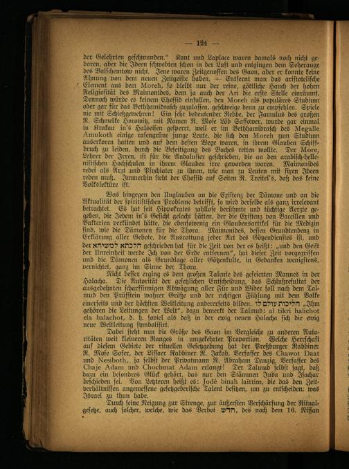 Dabei steht nun die Größe des Gaon in: Vergleiche zu anderen Autoritäten weit kleineren Ranges in umgekehrter Proportion. Welche Herrschaft auf diesem Gebiete der rituellen Gesetzgebung hat der Preßburger Rabbiner R. Mose Sofer, der Lissaer Rabbiner R. Jakob, Verfasser des Omvvol Oaat und dleAdoill, ja selbst der Privatmann R. Abraham Danzig, Verfasser des Omje /Vclam und Ellocllirmt /Vclam erlangt! Der Talmud selbst sagt, daß dazu ein besondres Glück gehört, das nur den Stämmen Juda und Jsachar beschieden sei. Von Letzteren heißt es: locke biimll laitlim, die das den Zeitverhältnissen angemessene gesetzgeberische Talent besitzen, um zu entscheiden/ was Israel zu thun habe.