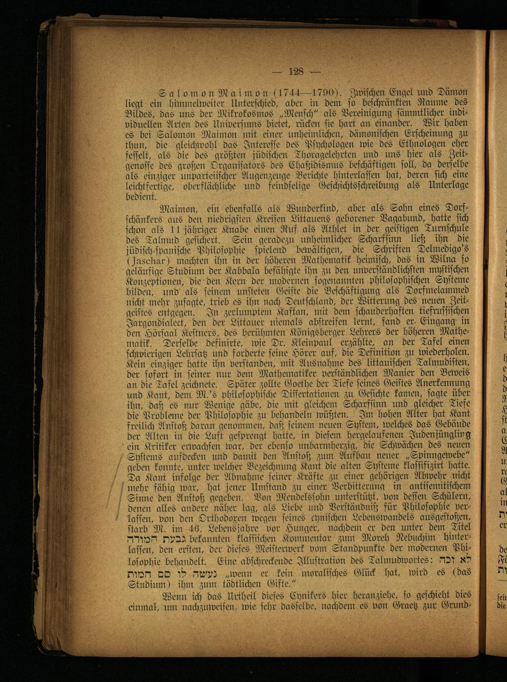 SaIo in onMai in o n (1711—1790). Zwischen Engel und Dämon liegt ein himmelweiter Unterschied, aber in dem so beschränkten Raume des Bildes, das uns der Mikrokosmos „Mensch" als Vereinigung sämmtlicher individuellen Arten des Universums bietet, rücken sie hart an einander. Wir haben es bei Salomo:: Maimon mit einer unheimlichen, dämonischen Erscheinung zu thun, die gleichwohl das Interesse des Psychologen wie des Ethnologen eher fesselt, als die des größten jüdischen Thoragelehrten und uns hier als Zeitgenosse des großen Organisators des Chassidismus beschäftigen soll, da derselbe als einziger unparteiischer Augenzeuge Berichte hinterlassen hat, deren sich eine leichtfertige, oberflächliche und feindselige Geschichtsschreibung als Unterlage bedient.