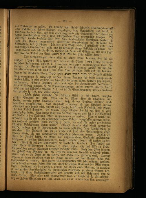als Anhänger zu gelten. Er brauche dem Nabbi keinerlei Sündenbekenntniß ^ oder Schilderung seiner Mängel vorzulegen, seine Verhältnisse und dergl. zu schildern, da das Herz vor ihm offen liege und alle Geheimnisse der Seele vor dessen prophetischem Geiste und hellsehendem Auge unverhüllt dalägen. Die Vorträge, welche derselbe hält, seien keine vorbereiteten Predigten, sondern je nach der Person unvermittelt eintretende Eingebungen im Zustande der Abstreifung des Irdischen. Die Art und Weise dieser Vorstellung übte einen nachhaltigen Eindruck auf mich, und ich verlangte einige Beispiele zu hören. Der junge Mann rieb sich die Stirn, wandte sich dann mit Ekstase zu mir und sagte mir, wie der Rabbi den Vers bei Elisa erklärt hatte: