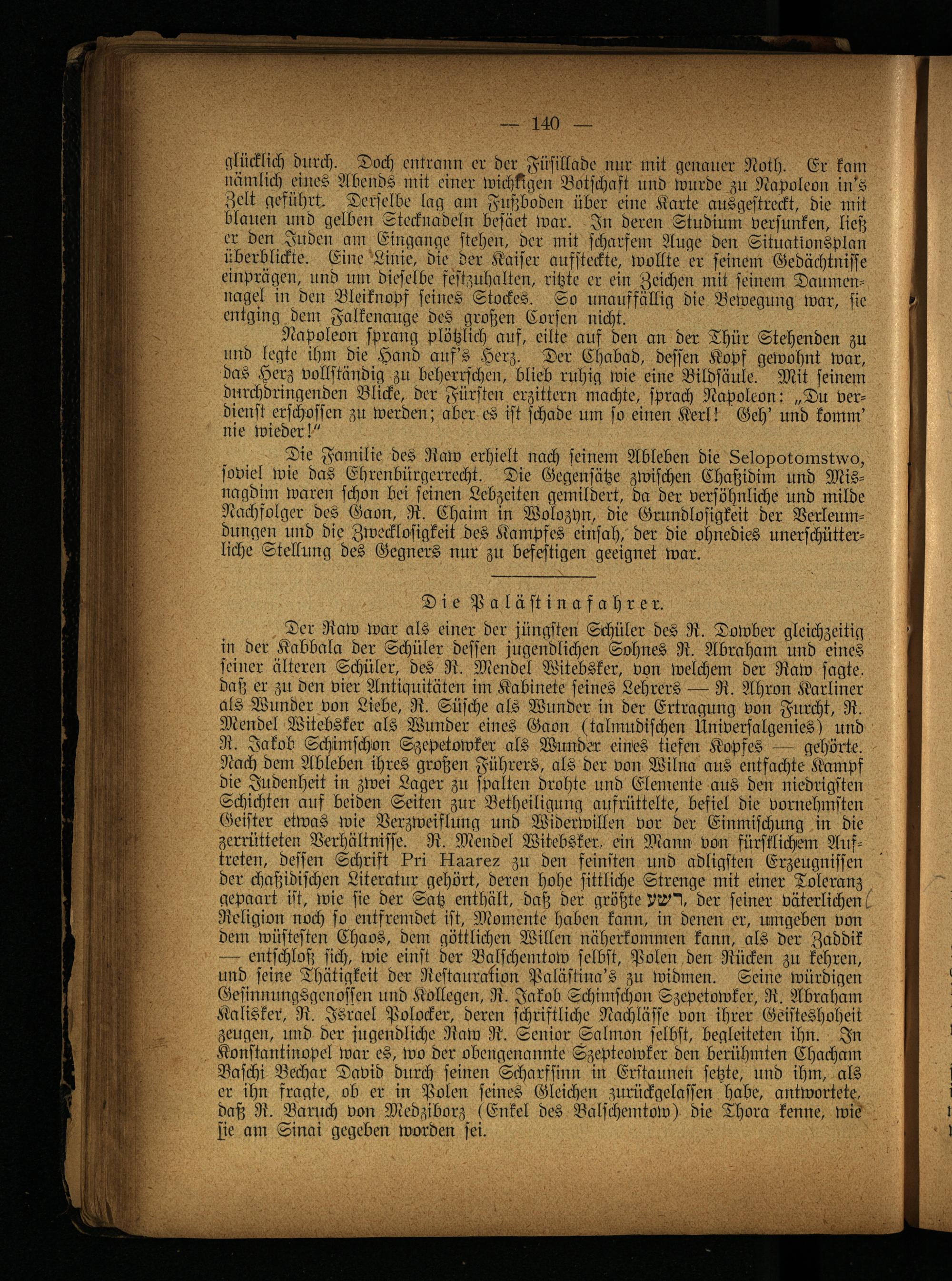 Der Raw war als einer der jüngsten Schüler des R. Dowber gleichzeitig in der Kabbala der Schüler dessen jugendlichen Sohnes R. Abraham und eines seiner älteren Schüler, des R. Mendel Witebsker, von welchem der Raw sagte, daß er zu den vier Antiquitäten im Kabinete seines Lehrers — R. Ahron Karliner als Wunder von Liebe, R. Süsche als Wunder in der Ertragung von Furcht, R. Mendel Witebsker als Wunder eines Gaon (talmudischen Universalgenies) und R. Jakob Schimschon Szepetowker als Wunder eines tiefen Kopfes — gehörte. Nach dem Ableben ihres großen Führers, als der von Wilna aus entfachte Kampf die Judenheit in zwei Lager zu spalten drohte und Elemente aus den niedrigsten Schichten aus beiden Seiten zur Betheiligung aufrüttelte, befiel die vornehmsten Geister etwas wie Verzweiflung und Widerwillen vor der Einmischung in die zerrütteten Verhältnisse. R. Mendel Witebsker. ein Mann von fürstlichem Auftreten, dessen Schrift Uri Haare? zu den feinsten und adligsten Erzeugnissen der chaßidischen Literatur gehört, deren hohe sittliche Strenge mit einer Toleranz gepaart ist, wie sie der Satz enthält, daß der größte PV"!, der seiner väterlichen >' Religion noch so entfremdet ist, Momente haben kann, in denen er, umgeben von dem wüstesten Chaos, dem göttlichen Willen näherkommen kann, als der Zaddik — entschloß sich, wie einst der Balschemtow selbst, Polen den Rücken zu kehren, und seine Thätigkcit der Restauration Palästina's zu widmen. Seine würdigen Gesinnungsgenossen und Kollegen, R. Jakob Schimschon Szepetowker, R. Abraham Kaliskev, R. Israel Polocker, deren schriftliche Nachlässe von ihrer Geisteshoheit zeugen, und der jugendliche Raw R. Senior Salmon selbst, begleiteten ihn. In .Konstantinopel war es, wo der obengenannte Szepteowker den berühmten Chacham Baschi Bechar David durch seinen Scharfsinn in Erstaunen setzte, und ihm, als er ihn fragte, ob er in Polen seines Gleichen zurückgelassen habe, antwortete, daß N. Baruch von Medziborz (Enkel des Balschemtow) die Thora kenne, wie sie an: Sinai gegeben worden sei.