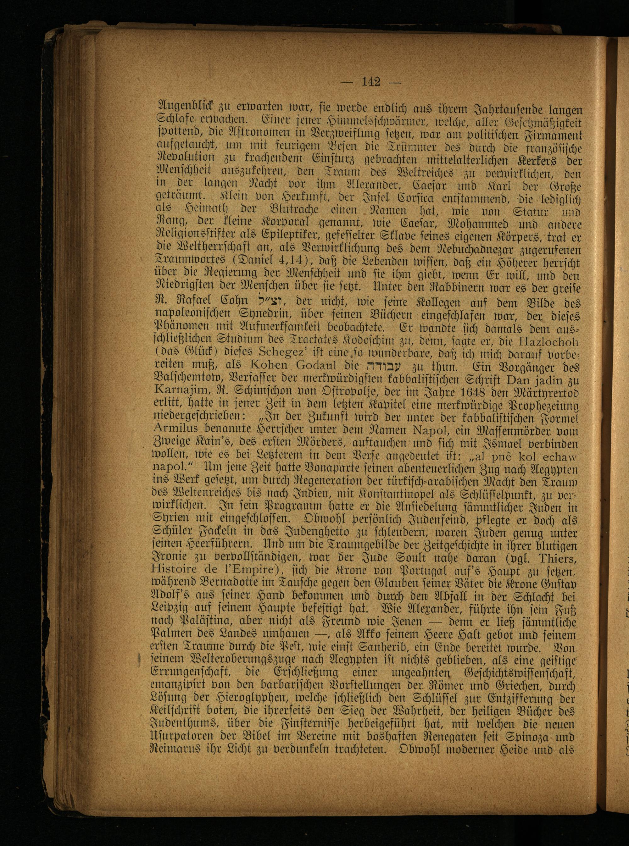 Augenblick zu erwarten war, sie werde endlich aus ihrem Jahrtausende langen Schlafe erwachen. Einer jener Himmelsschwärmer, welche, aller Gesetzmäßigkeit spottend, die Astronomen in Verzweiflung setzen, war am politischen Firmament aufgetaucht, um mit feurigem Besen die Trümmer des durch die französische Revolution zu krachendem Einsturz gebrachten mittelalterlichen Kerkers der Menschheit auszukehren, den Traum des Weltreiches zu verwirklichen, den in der langen Nacht vor ihm Alexander, Caesar und Karl der Große geträumt. Klein von Herkunft, der Insel Corsica entstammend, die lediglich als Hcimath der Blutrache einen Namen hat, wie von Statur und Rang, der kleine Korporal genannt, wie Caesar, Mohammed und andere Neligionsstifter als Epileptiker, gefesselter Sklave seines eigenen Körpers, trat er die Weltherrschaft an, als Verwirklichung des dem Nebuchadnezar zugerufenen Traumwortes (Daniel 4,14), daß die Lebenden wissen, daß ein Höherer herrscht über die Regierung dev Menschheit und sie ihm giebt, wenn Er will, und den Niedrigsten der Menschen über sie setzt. Unter den Rabbinern war es der greise R. Rafael Cohn der nicht, wie seine Kollegen auf dein Bilde des
