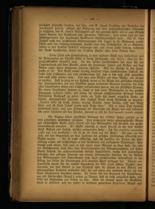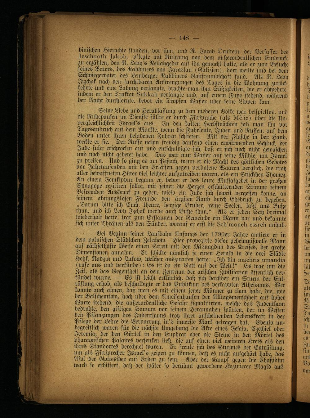 binischen Hierachie standen, vor ihm, und R. Jacob Ornstein, der Verfasser des stesebuotb jalcob, pflegte mit Rührung von dem außerordentlichen Eindrücke zu erzählen, den R. Levy's Ncilahgebet auf ihn gemacht hatte, als er zum Besuche seines Vaters, des Rabbiners von Jaroslau (Galizien), dort weilte und bei dem Schwiegervater des Lembcrger Rabbiners Gastfreundschaft fand. Als R. Levv Jizchak nach den furchtbaren Anstrengungen des Tages in die Wohnung zurückkehrte und eine Labung verlangte, brachte man ihm. Süßigkeiten,, die er abwehrte, indem er den Traktat Lulstal: verlangte und, auf einen: Fuße stehend, während der Nacht durchlernte, bevor ein Tropfen Wasser über seine Lippen kam.