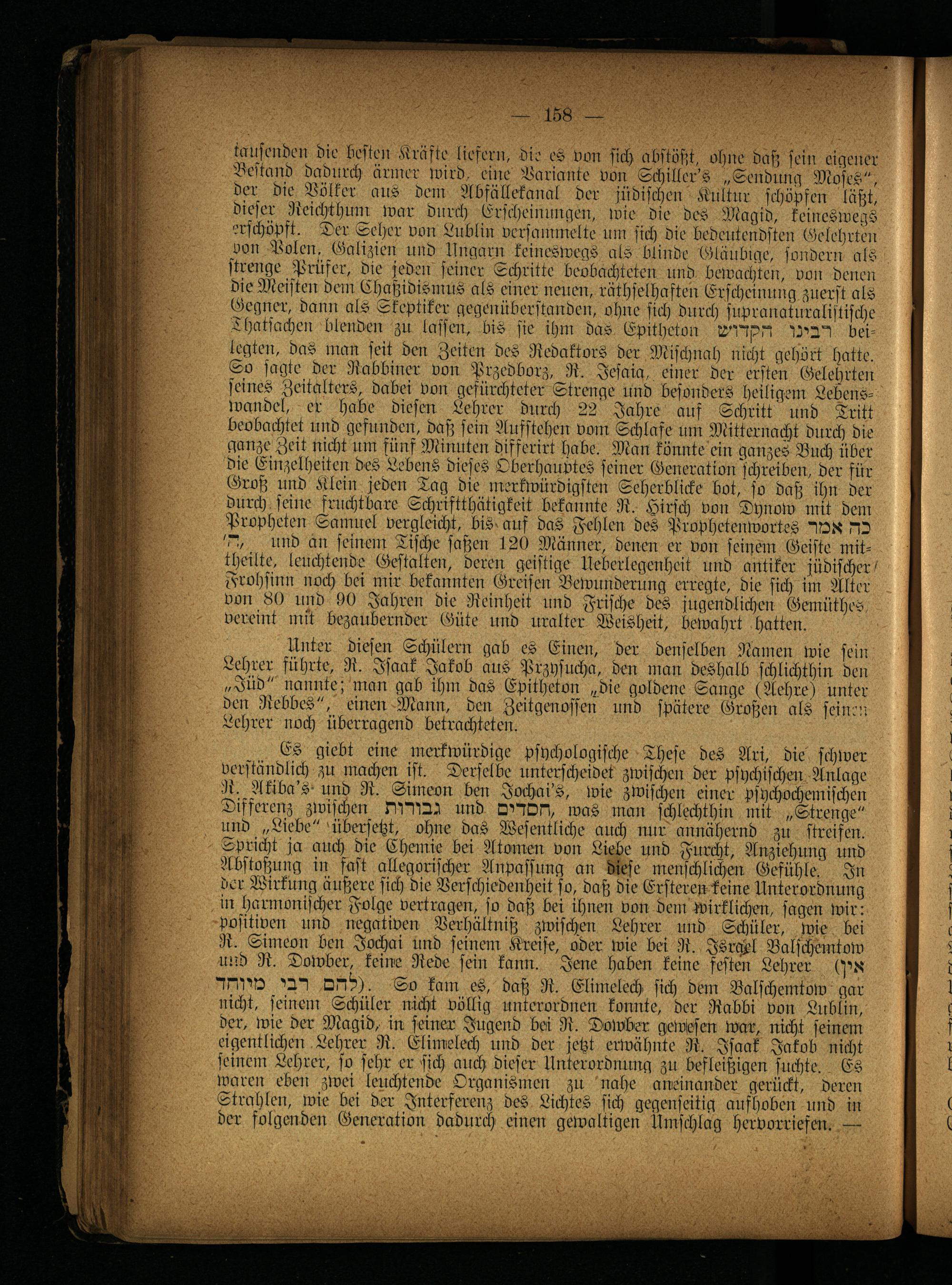 Unter diesen Schülern gab es Einen, der denselben Namen wie sein Lehrer führte, R. Isaak Jakob aus Przysucha, den man deshalb schlichthin den „Jüd" nannte; man gab ihm das Epitheton ,,die goldene Sange (Aehre) unter den Rebbcs", einen Mann, den Zeitgenossen und spätere Großen als sein."?. Lehrer noch überragend betrachteten.