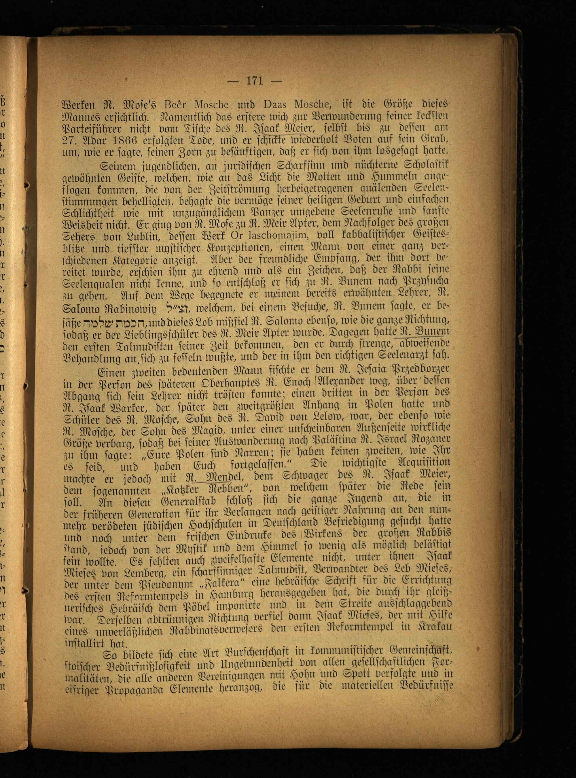 machte er jedoch mit R. Men del, dem Schwager des R. Isaak Meier, dem sogenannten „Kotzker Rebben", von welchem später die Rede sein soll. An diesen Generalstab schloß sich die ganze Jugend an, die in der früheren Generation für ihr Verlangen nach geistiaer Nahrung an den nunmehr verödeten jüdischen Hochschulen in Deutschland Befriedigung gesucht hatte und noch unter dem frischen Eindrücke des Wirkens der großen Rabbis band, jedoch von der Mystik und dem Himmel so wenig als möglich belästigt sein wollte. Es fehlten auch zweifelhafte Elemente nicht, unter ihnen Isaak Mieses von Lemberg, ein scharfsinniger Talmudist, Verwandter des Leb Mieses, der unter dem Pseudonym „Falkera" eine hebräische Schrift für die Errichtung des ersten Reformtempcls in Hamburg herausgegeben hat. die durch ihr gleiß- nerisches Hebräisch denn Pöbel imponirtc und iu den: Streite ausschlaggebend war. Derselben abtrünnigen Richtung verfiel dann Isaak Mieses, der mit Hilfe eines unverläßlichen Rabbinatdverivesers den ersten Resormtempel iu Krakau installirt hat.