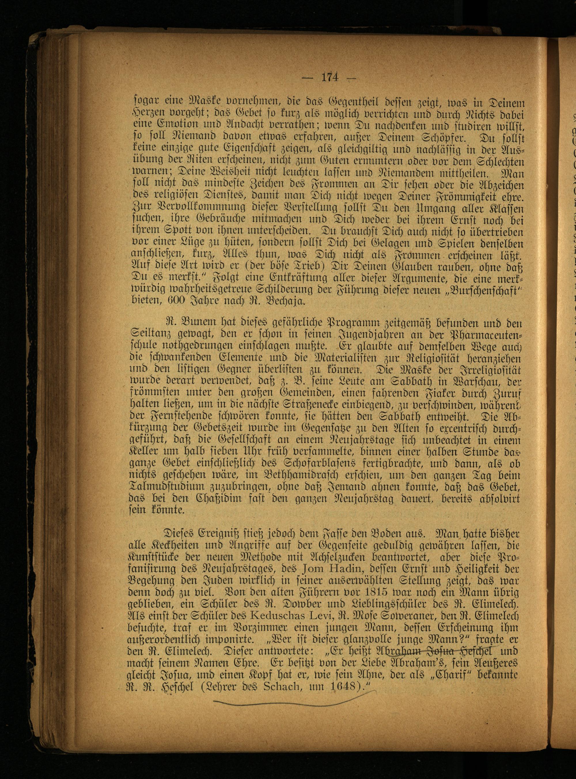 sogar eine Maske vornehmen, die das Gegentheil dessen zeigt, was in Herzen vorgeht; das Gebet so kurz als möglich verrichten und durch Nichts dabei eine Emotion und Andacht verrathen; wenn Dn Nachdenken und studiren willst, so soll Niemand davon etwas erfahren, außer Deinem Schöpfer. Du sollst keine einzige gute Eigenschaft zeigen, als gleichgiltig lind nachlässig in der Ausübung der Riten erscheinen, nicht zum Guten ermuntern oder vor dem Schlechten warnen; Deine Weisheit nicht leuchten lassen und Niemandem mittheileu. Man soll nicht das mindeste Zeichen des Frommen an Dir sehen oder die Abzeichen des religiösen Dienstes, damit man Dich nicht wegen Deiner Frömmigkeit ehre. Znr Vervollkommnung dieser Verstellung sollst Du den Umgang aller Klassen suchen, ihre Gebräuche mitmachen und Dich weder bei ihrem Ernst noch Lei ihrem Spott von ihnen unterscheiden. Du brauchst Dich auch nicht so übertrieben vor einer Lüge zu hüten, sondern sollst Dich bei Gelagen und Spielen denselben anschließen, kurz, Alles thun, was Dich nicht als Frommen erscheinen läßt. Auf diese Art wird er (der böse Trieb) Dir Deinen Glauben rauben, ohne daß Dn es merkst." Folgt eine Entkräftung aller dieser Argumente, die eine merkwürdig wahrheitsgetreue Schilderung der Führung dieser neuen „Burschenschaft" bieten, 600 Jahre nach R. Bechaja.
