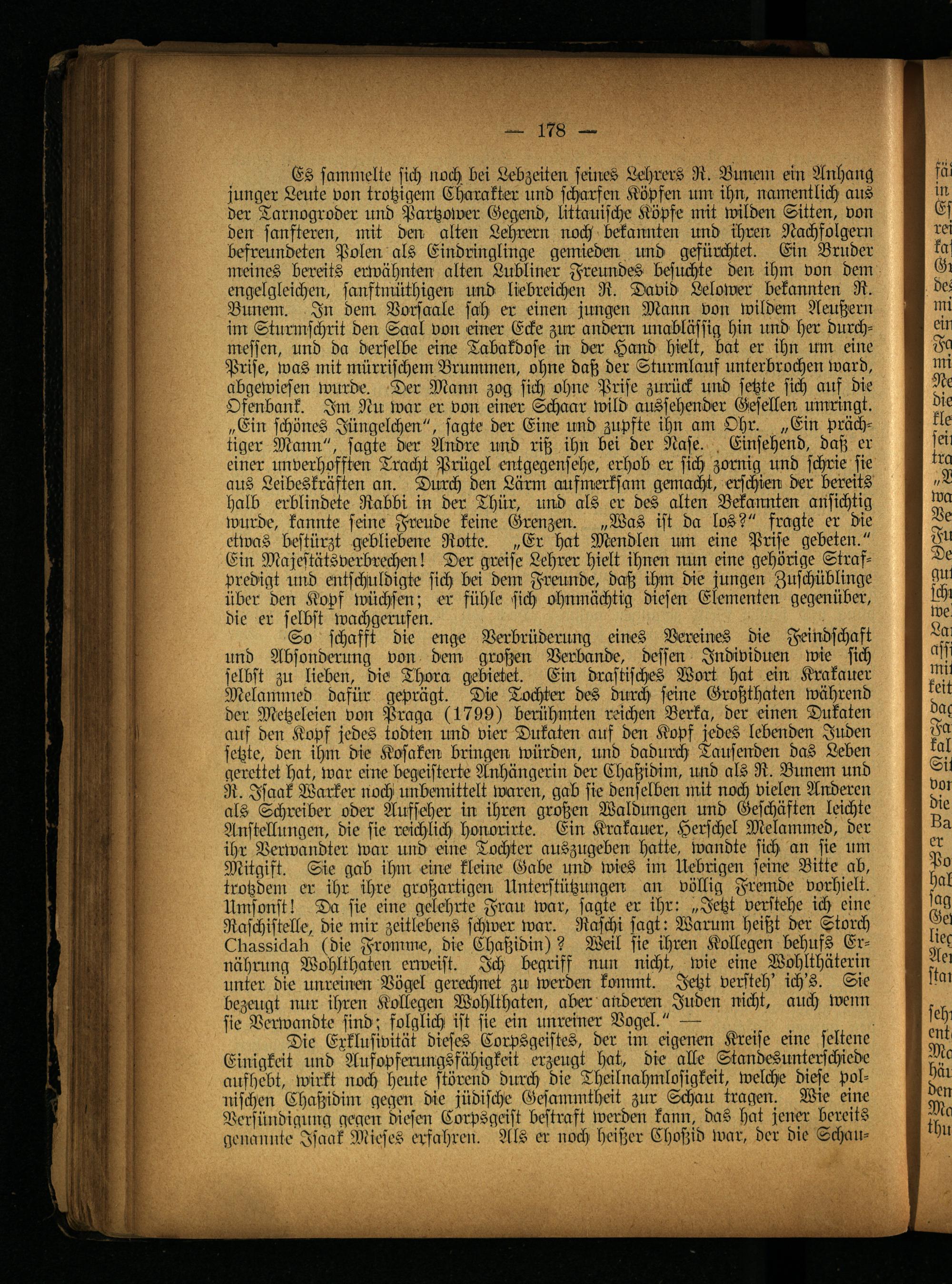 Die Exklusivität dieses Corpsgeistes, der in: eigenen Kreise eine seltene Einigkeit und Aufopferungsfähigkeit erzeugt hat, die alle Standesunterschiede aufhebt, wirkt noch heute störend durch die Theilnahmlosigkeit, welche diese polnischen Chaßidim gegen die jüdische Gesammtheit zur Schau tragen. Me eine Versündigung gegen diesen Corpsgeist bestraft werden kann, das hat jener bereits genannte Isaak Vlieses erfahren. Als er noch heißer Choßid war, der die Schau-