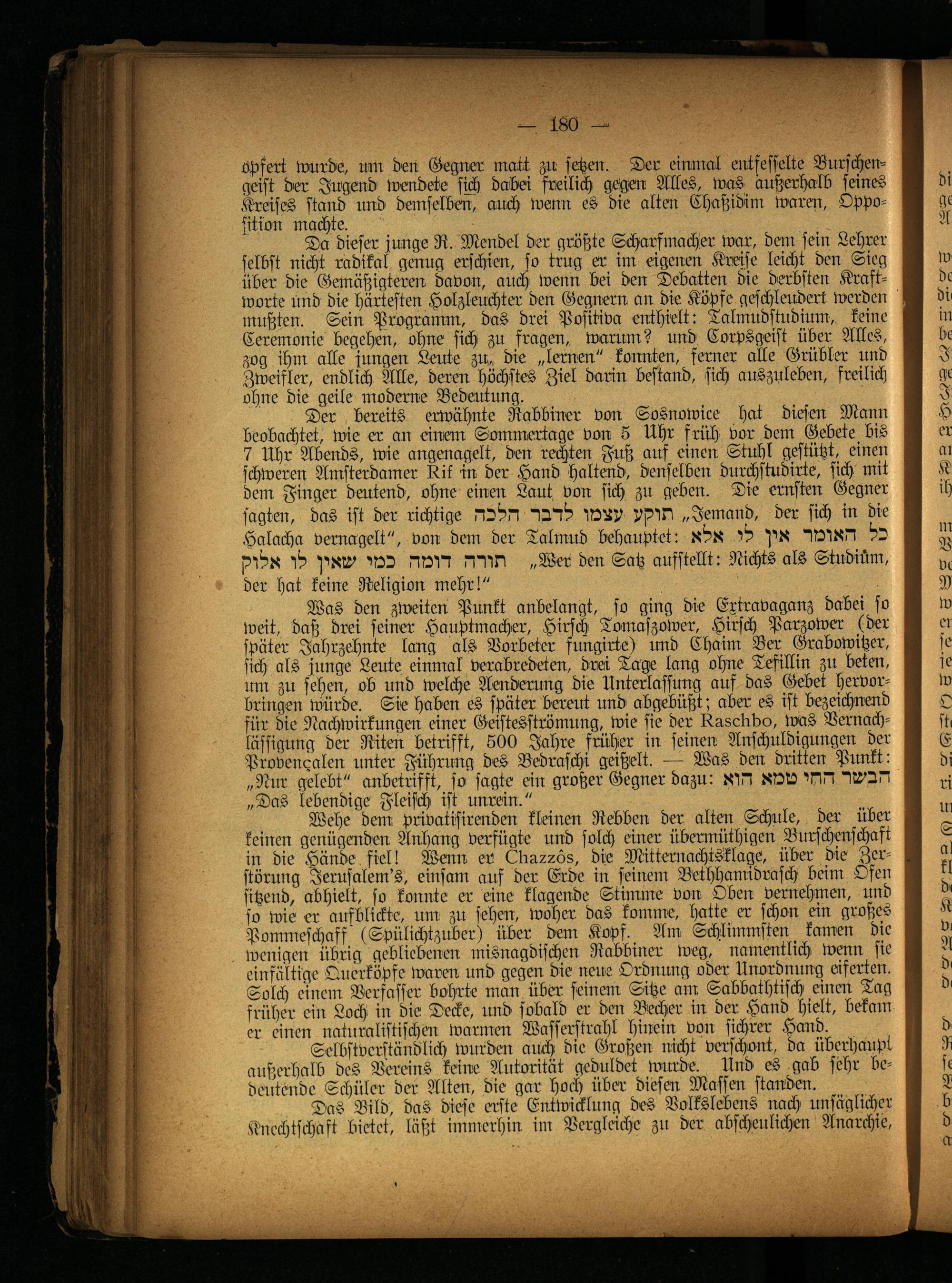 opfert wurde, um den Gegner matt zu setzen. Der einmal entfesselte Burschengeist der Jugend wendete sich dabei freilich gegen Alles, was außerhalb seines Kreises stand und demselben, auch wenn es die alten Chaßidim waren, Opposition machte.