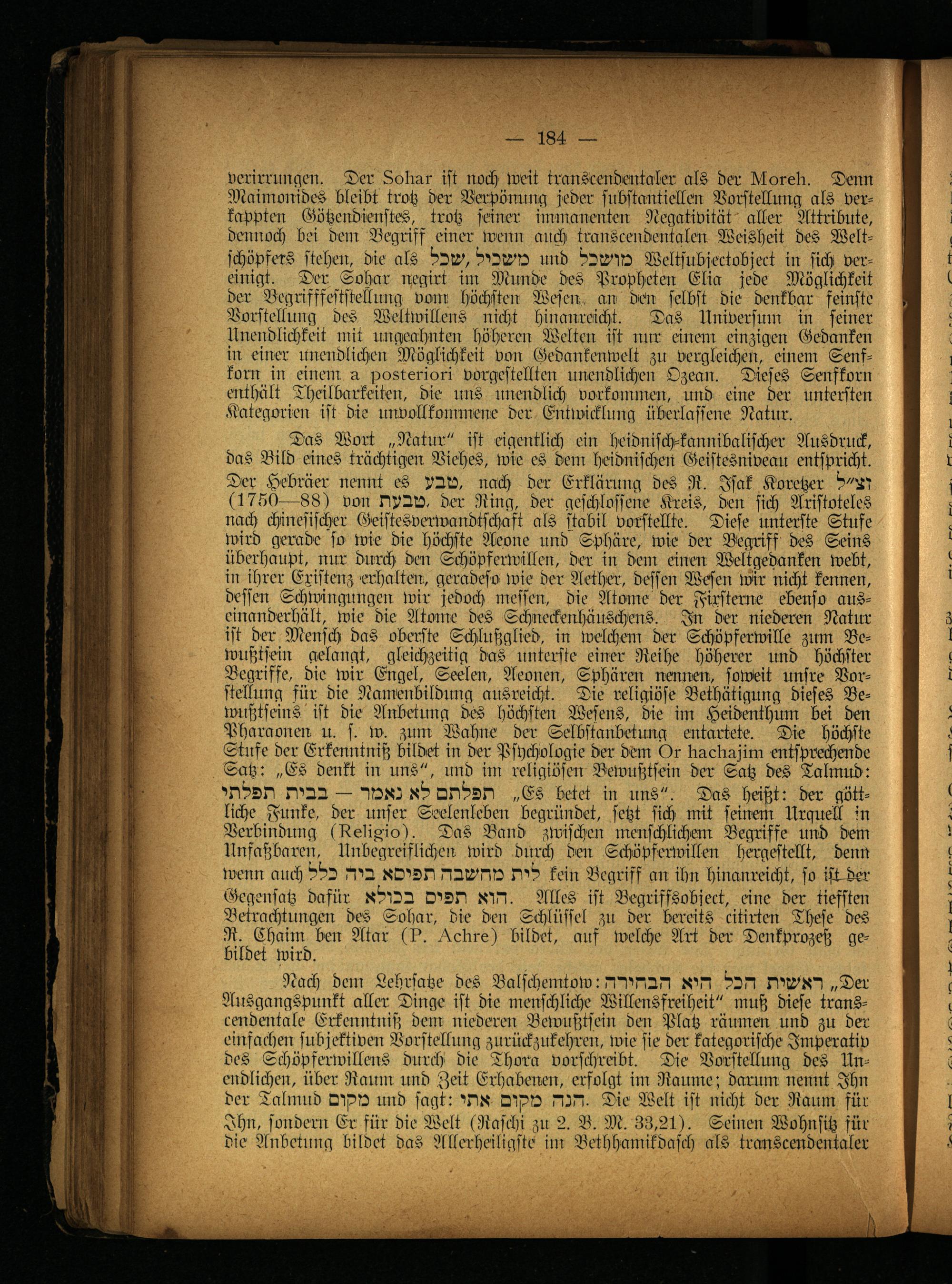 Verirrungen. Der Lobär ist noch weit transcendentaler als der bloreb. Denn Maimoilides bleibt trotz der Berpönnng jeder substantiellen Vorstellung als verkappten Götzendienstes, trotz seiner immanenten Negativität aller Attribute, dennoch bei dem Begriff einer wenn auch transcendentalen Weisheit des Welt- schöpfers stehen, die als ^226 ^2l^!2 und P2L012 Weltsubjectobject in sich vereinigt. Der Sohar negirt iur Ncuilde des Propheten Elia jede Möglichkeit der Begrifffeststellung vom höchsten Wesen., an- den selbst die denkbar feinste Vorstellung des Weltwillens nicht hinanreicht. Das Universum in feiner Unendlichkeit mit ungeahnten höheren Welten ist nur einem einzigen Gedanken in einer unendlichen Möglichkeit von Gedankenwelt zu vergleichen, einen: Senfkorn in einein a posteriori vorgestellten unendlichen Ozean. Dieses Senfkorn enthält Theilbarkciten, die uns unendlich Vorkommen, und eine der untersten Kategorien ist die unvollkommene der Entwicklung überlassene Natur.