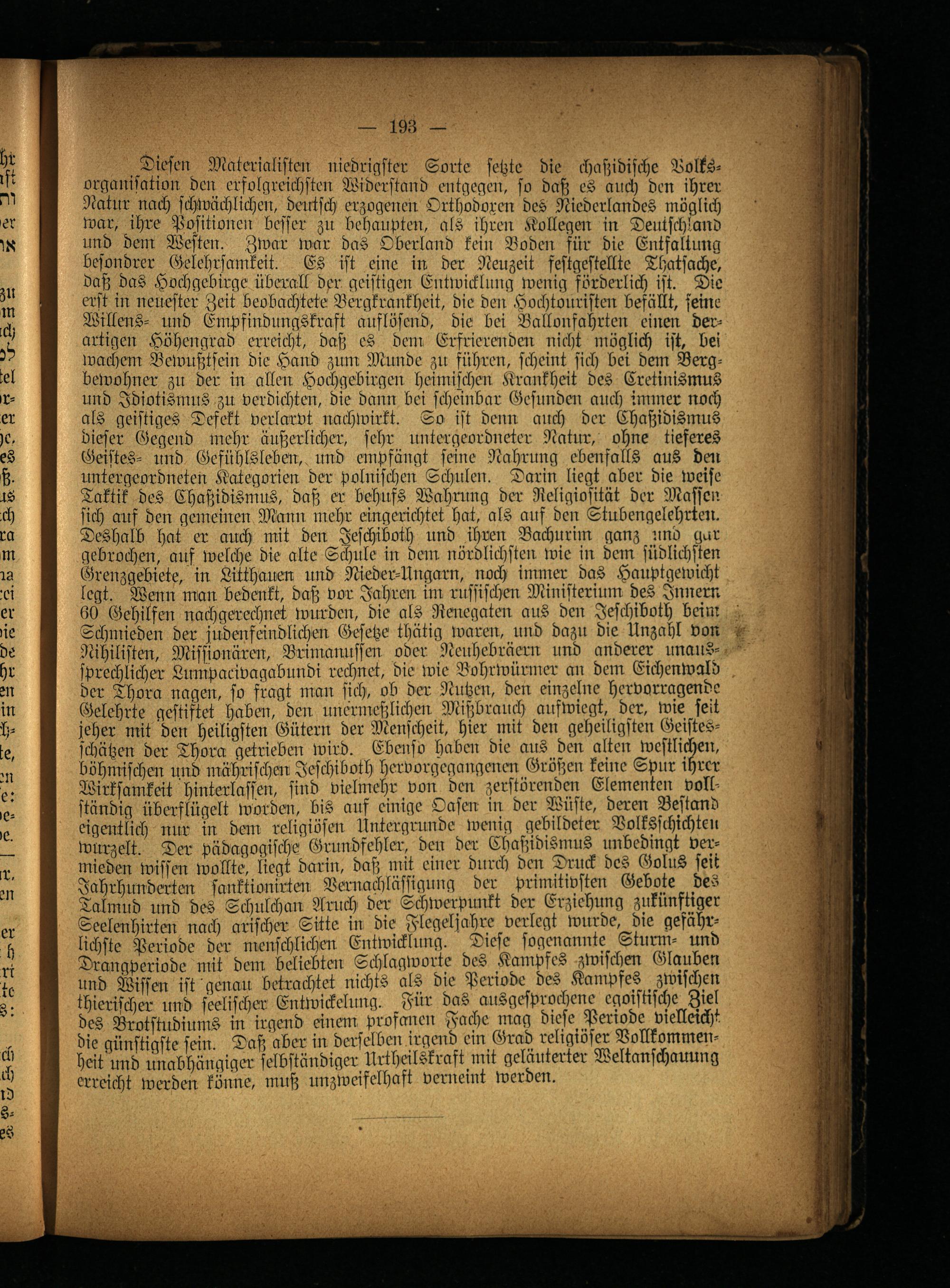 diesen Materialisten niedrigster Sorte setzte die chaßidische Polks- organisation den erfolgreichsten Widerstand entgegen, so daß es auch den ihrer Natur nach schwächlichen, deutsch erzogenen Orthodoxen des Niedcrlandes möglich war, ihre Positionen besser zu behaupten, als ihren Kollegen in Deutschland und dem Westen. Zwar war das Oberland kein Boden für die Entfaltung besondrer Gelehrsamkeit. Es ist eine in der Neuzeit festgestelltc Thatsache, daß das Hochgebirge überall der geistigen Entwicklung wenig förderlich ist. Die erst in neuester Zeit beobachtete Bergkrankheit, die den Hochtouristen befällt, feine Willens- und Empfindungskraft auflösend, die bei Ballonfahrten einen derartigeil Höhengrad erreicht, daß es dem Erfrierenden nicht möglich ist, bei wachem Bewußtsein die Hand zum Munde zu führen, scheint sich bei dem Bergbewohner zu der in allen Hochgebirgen heimischen Krankheit des Cretinismus und Idiotismus zu verdichten, die dann bei scheinbar Gesunden auch immer noch als geistiges Defekt verlarvt nachwirkt. So ist denn auch der Chaßidismus dieser Gegend mehr äußerlicher, sehr untergeordneter Natur, ohne tieferes Geistes- und Gefühlsleben, und empfängt seine Nahrung ebenfalls aus den untergeordneten Kategorien der polnischen Schulen. Darin liegt aber die weise Taktik des Chaßidismus, daß er behufs Wahrung der Religiosität der Massen sich auf den gemeinen Männ mehr eingerichtet hat, als ans den Stubengelehrten. Deshalb hat er auch mit den Jeschiboth und ihren Bachurim ganz lind gar gebrochen, auf welche die alte Schule in dein nördlichsteil wie in dem südlichsten Grenzgebiete, in Litthauen und Nieder-Ungarn, noch immer das Hauptgewicht legt. Wenn man bedenkt, daß vor Jahren im russischen Ministerium des Innern 60 Gehilfen nachgerechnet wurden, die als Renegaten aus den Jeschiboth beim Schmieden der judenfeindlichen Gesetze thätig waren, und dazu die Unzahl von Nihilisten, Missionären, Brnnanussen oder Nenhebräcrn und anderer unaussprechlicher Lumpaeivagabundi rechnet, die wie Bohrwürmer an dem Eichenwald der Thora nagen, so fragt man sich, ob der Nutzen, den einzelne hervorragende Gelehrte gestiftet haben, den unermeßlichen Mißbrauch aufwiegt, der, wie seit jeher mit den heiligsten Gütern der Menscheit, hier mit den geheiligsten Geistesschätzen der Thora getrieben wird. Ebenso habeil die aus den alten westlicheil, böhmischen und mährischen Jeschiboth hcrvorgegangenen Größen keine Spur ihrer Wirksamkeit hinterlassen, sind vielmehr von den zerstörenden Elementen vollständig überflügelt worden, bis auf einige Oasen in der Wüste, deren Bestand eigentlich nur in dein religiösen Untergründe wenig gebildeter Volksschichten wurzelt. Der pädagogische' Grundfehler, den der Chaßidismus unbedingt vermieden wissen wollte, liegt darin, daß mit einer durch den Druck des Golus seit Jahrhunderten sanktionirten Vernachlässigung der primitivsten Gebote des Talmud und des Schulchan Aruch der Schwerpunkt der Erziehung zukünftiger Seelenhirteil nach arischer Sitte in die Flegeljahre verlegt wurde, die gefährlichste Periode der menschlichen Entwicklung. Diese sogenannte Sturm- und Drangperiode nüt dem beliebteil Schlagworte des Kampfes zwischen Glauben und wissen ist genau betrachtet nichts als die Periode des Kampfes zwischen thierischer und seelischer Entwickelung. Für das ausgesprochene egoistische Ziel des Brotstudiums in irgend einem profanen Fache mag diese Periode vielleicht die günstigste sein. Daß aber in derselben irgend ein Grad religiöser Vollkommen- heit'und unabhängiger selbständiger llrtheilskraft mit geläuterter Weltanschauung erreicht werden könne, muß unzweifelhaft verneint werden.