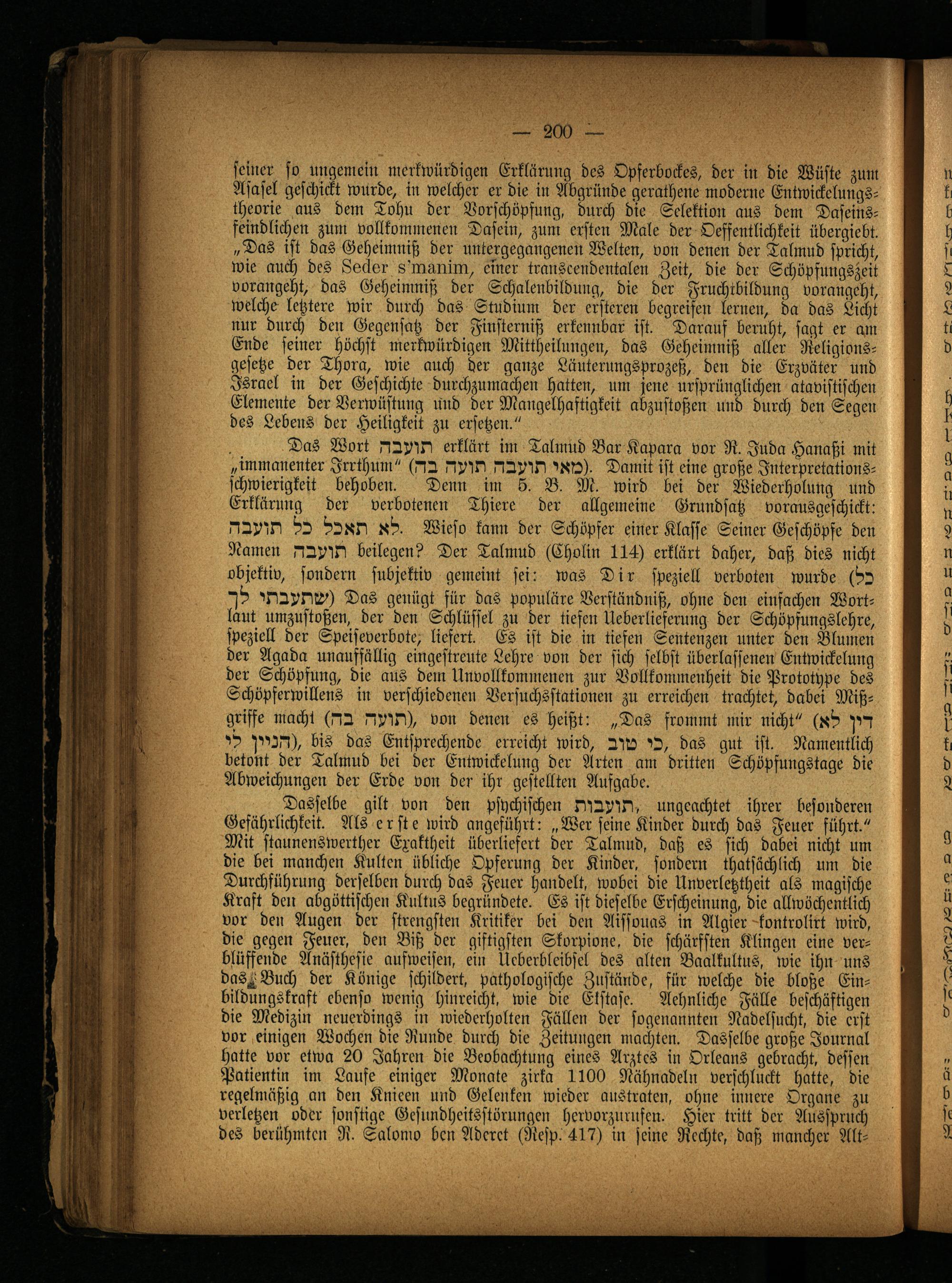 seiner so ungemein merkwürdigen Erklärung des Opferbockes, der in die Wüste zum Asasel geschickt wurde, in welcher er die in Abgründe gerathene moderne Entwickelungstheorie aus dem Tohu der Vorschöpfung, durch die Selektion aus dem Daseinsfeindlichen zum vollkommenen Dasein, zum ersten Male der Oeffentlichkeit übergiebt. „Das ist das Geheimniß der untergegangenen Welten, von denen der Talmud spricht, wie auch des Lecker 8'mnnim, einer trauscendentalen Zeit, die der Schöpfungszeit vorangeht, das Geheimniß der Schalenbildung, die der Fruchtbildung vorangcht, welche letztere wir durch das Studium der elfteren begreifen lernen, da das Licht nur durch den Gegensatz der Fiusterniß erkennbar ist. Darauf beruht, sagt er am Ende seiner höchst merkwürdigen Mittheilungen, das Geheimniß aller Religionsgesetze der Thora, wie auch der ganze Läuterungsprozeß, den die Erzväter und Israel in der Geschichte durchzumachen hatten, um jene ursprünglichen atavistischen Elemente der Verwüstung und der Mangelhaftigkeit abzustoßen und durch den Segen des Lebens der Heiligkeit zu ersetzen."