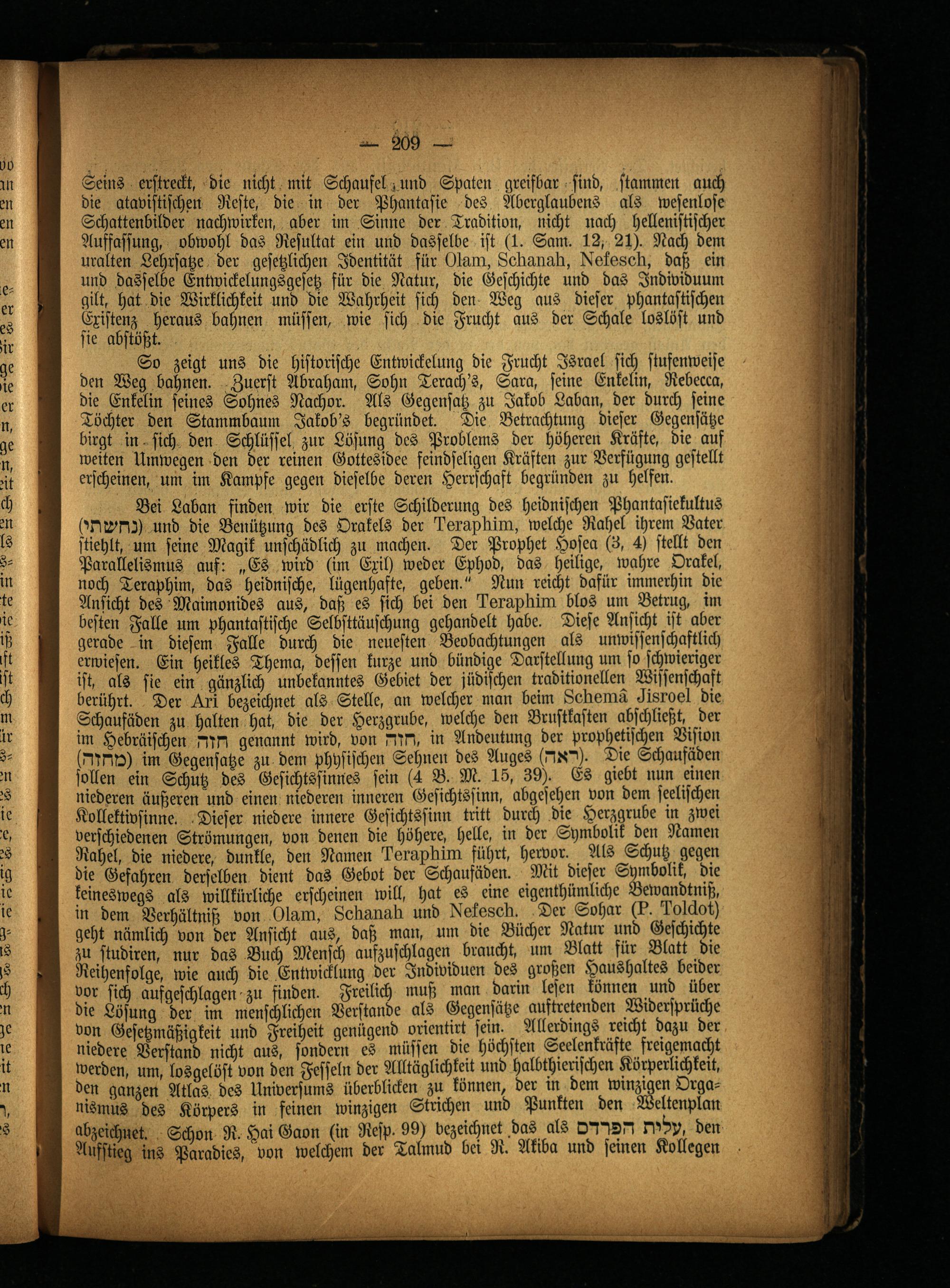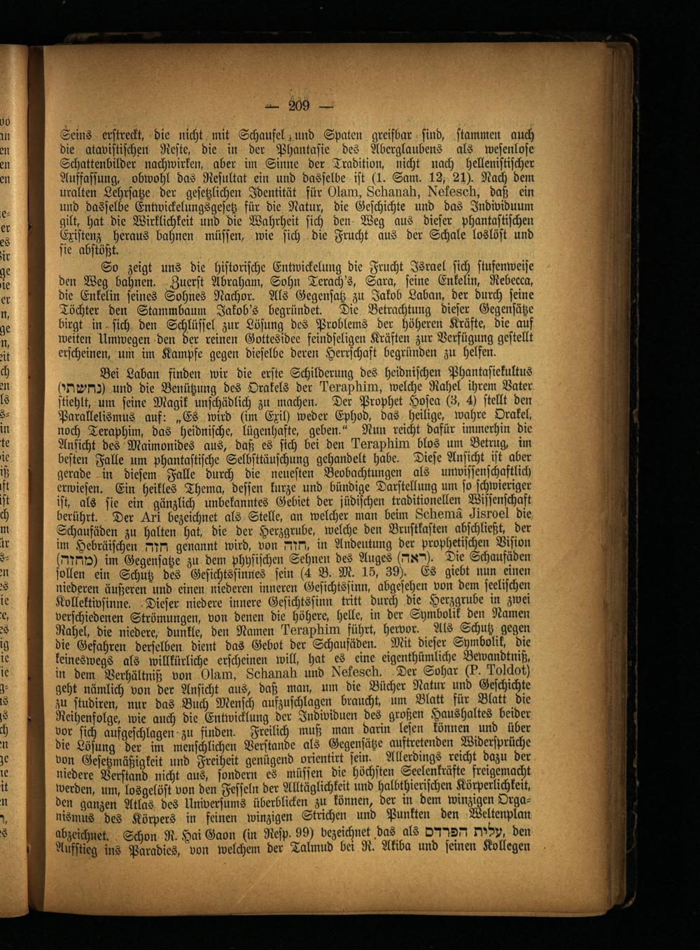 Bei Laban finden wir die erste Schilderung des heidnischen Phantasiekultus ('sUr-Nch und die Benützung des Orakels der 'perapüim, welche Rahel ihrem Vater stiehlt, um seine Magik unschädlich zu machen. Der Prophet Hosea (3, 4) stellt den Parallelismus auf: „Es wird (im Exil) weder Ephod, das heilige, wahre Orakel, noch Teraphim, das heidnische, lügenhafte, geben." Nun reicht dafür immerhin die Ansicht des Maimonides aus, daß es sich bei den Terapüim blos um Betrug, im besten Falle um phantastische Selbsttäuschung gehandelt habe. Diese Ansicht ist aber gerade in diesem Falle durch die neuesten Beobachtungen als unwissenschaftlich erwiesen. Ein heikles Thema, dessen kurze und bündige Darstellung um so schwieriger ist, als sie ein gänzlich unbekanntes Gebiet der jüdischen traditionellen Wissenschaft berührt. Der bezeichnet als Stelle, an welcher man beim Lellemä ckikmoel die Schaufäden zu halten hat, die der Herzgrube, welche den Brustkasten abschließt, der im Hebräischen N1N genannt wird, von illN, in Andeutung der prophetischen Vision (N1NQ) im Gegensätze zu dem physischen Sehnen des Auges (NX-H. Die Schaufäden sollen ein Schutz des Gesichtssinnes sein (4 B. M. 15, 39). Es giebt nun einen niederen äußeren und einen niederen inneren Gesichtssinn, abgesehen von dem seelischen Kollektivsinne. Dieser niedere innere Gesichtssinn tritt durch die Herzgrube in zwei verschiedenen Strömungen, von denen die höhere, Helle, in der Symbolik den Namen Rahel, die niedere, dunkle, den Namen DernMin führt, hervor. Als Schutz gegen die Gefahren derselben dient das Gebot der Schaufäden. Mit dieser Symbolik, die keineswegs als willkürliche erscheinen will, hat es eine eigenthümliche Bewandtniß, in dem Verhültniß von OInm, Lelmund und Der Sohar (?. Toläot)