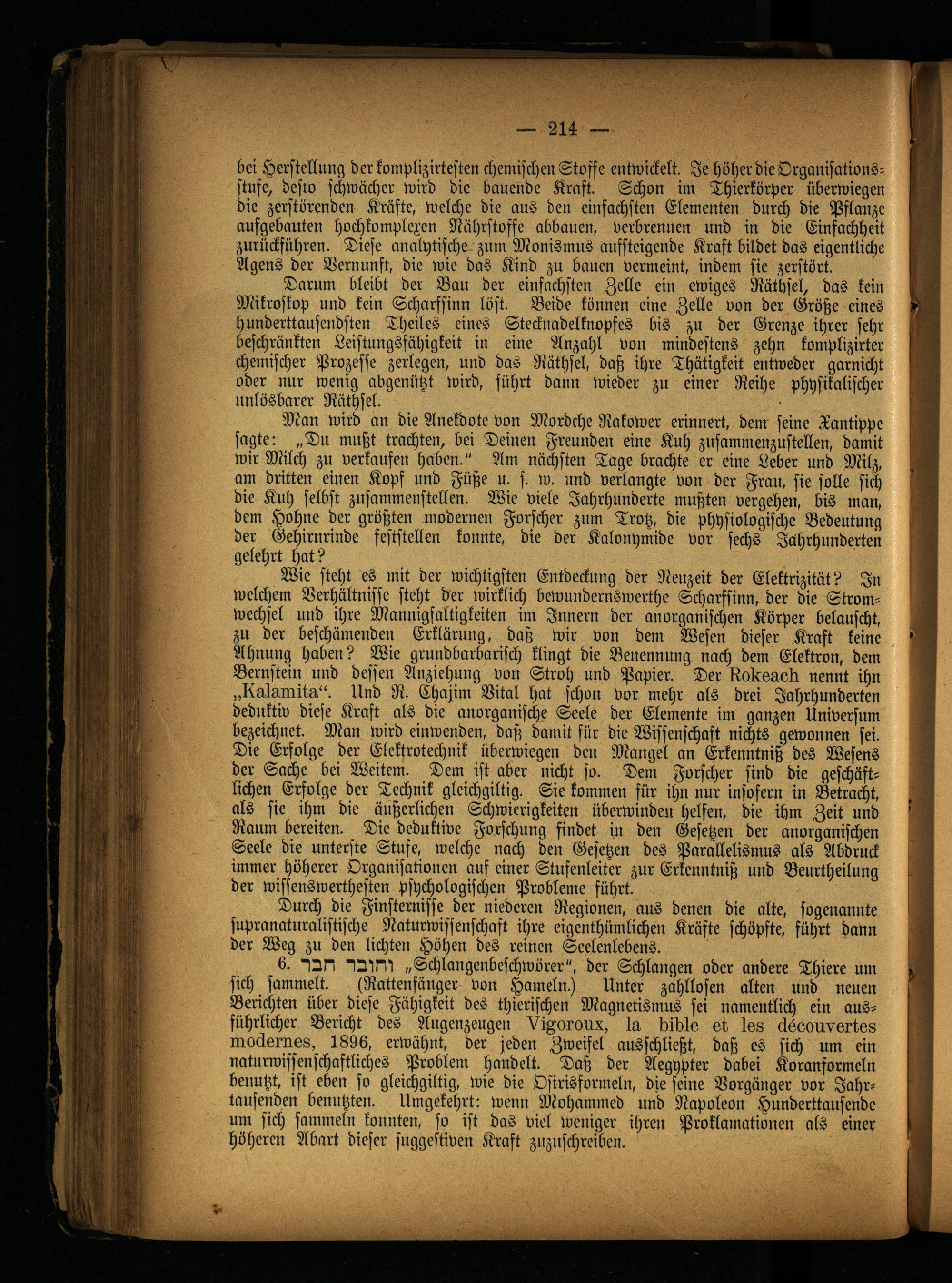 Wie steht es mit der wichtigsten Entdeckung der Neuzeit der Elektrizität? In welchem Verhältnisse steht der wirklich bewundernswertste Scharfsinn, der die Stromwechsel und ihre Mannigfaltigkeiten im Innern der anorganischen Körper belauscht, zu der beschämenden Erklärung, daß wir von dem Wesen dieser Kraft keine Ahnung haben? Wie grundbarbarisch klingt die Benennung nach dem Elektron, dem Bernstein und dessen Anziehung von Stroh und Papier. Der Uollöuell nennt ihn „XulunUtu". Und R. Chajim Vital hat schon vor mehr als drei Jahrhunderten deduktiv diese Kraft als die anorganische Seele der Elemente im ganzen Universum bezeichnet. Man wird einwenden, daß damit für die Wissenschaft nichts gewonnen sei. Die Erfolge der Elektrotechnik überwiegen den Mangel an Erkenntniß des Wesens der Sache bei Weitem. Dem ist aber nicht so. Dem Forscher sind die geschäftlichen Erfolge der Technik gleichgiltig. Sie kommen für ihn nur insofern in Betracht, als sie ihm die äußerlichen Schwierigkeiten überwinden helfen, die ihm Zeit und Raum bereiten. Die deduktive Forschung findet in den Gesetzen der anorganischen Seele die unterste Stufe, welche nach den Gesetzen des Parallelismus als Abdruck immer höherer Organisationen auf einer Stufenleiter zur Erkenntniß und Beurtheilung der wissenswerthesten psychologischen Probleme führt.