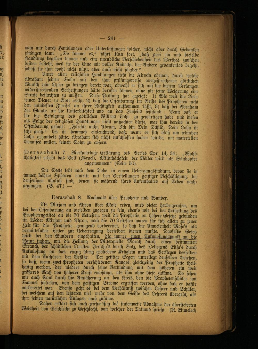 Abraham seinen Sohn auf den ihm Prüfungsweise ausgesprochenen göttlichen Wunsch zum Opfer zu bringen bereit war, obwohl er sich auf die diesem Verlangen widersprechenden Verheißungen hätte berufen können, ohne für seine Weigerung eine Strafe befürchten zu müssen. Diese Prüfung hat gezeigt: 1) Wie weit die Liebe seiner Diener zu Gott reicht, 2) daß die Offenbarung im Geiste des Propheten nicht den mindesten Zweifel an ihrer Richtigkeit aufkommen läßt, 3) daß bei Abraham der Glaube an die Unsterblichkeit und an das Jenseits feststand. Denn daß er für die Befolgung des göttlichen Willens Lohn zu gewärtigen habe und diesen als Folge der religiösen Handlungen nicht mißachten dürfe, war ihm bereits in der Offenbarung gesagt: „Fürchte nicht, Abram, Ich bin Dein Schild, Dein Lohn ist sehr groß." Es ist demnach einleuchtend, daß, wenn es sich bloß um irdischen Lohn gehandelt hätte, Abraham sich nicht entschlossen haben würde, um materiellen Genusses willen, seinen Sohn zu opfern.