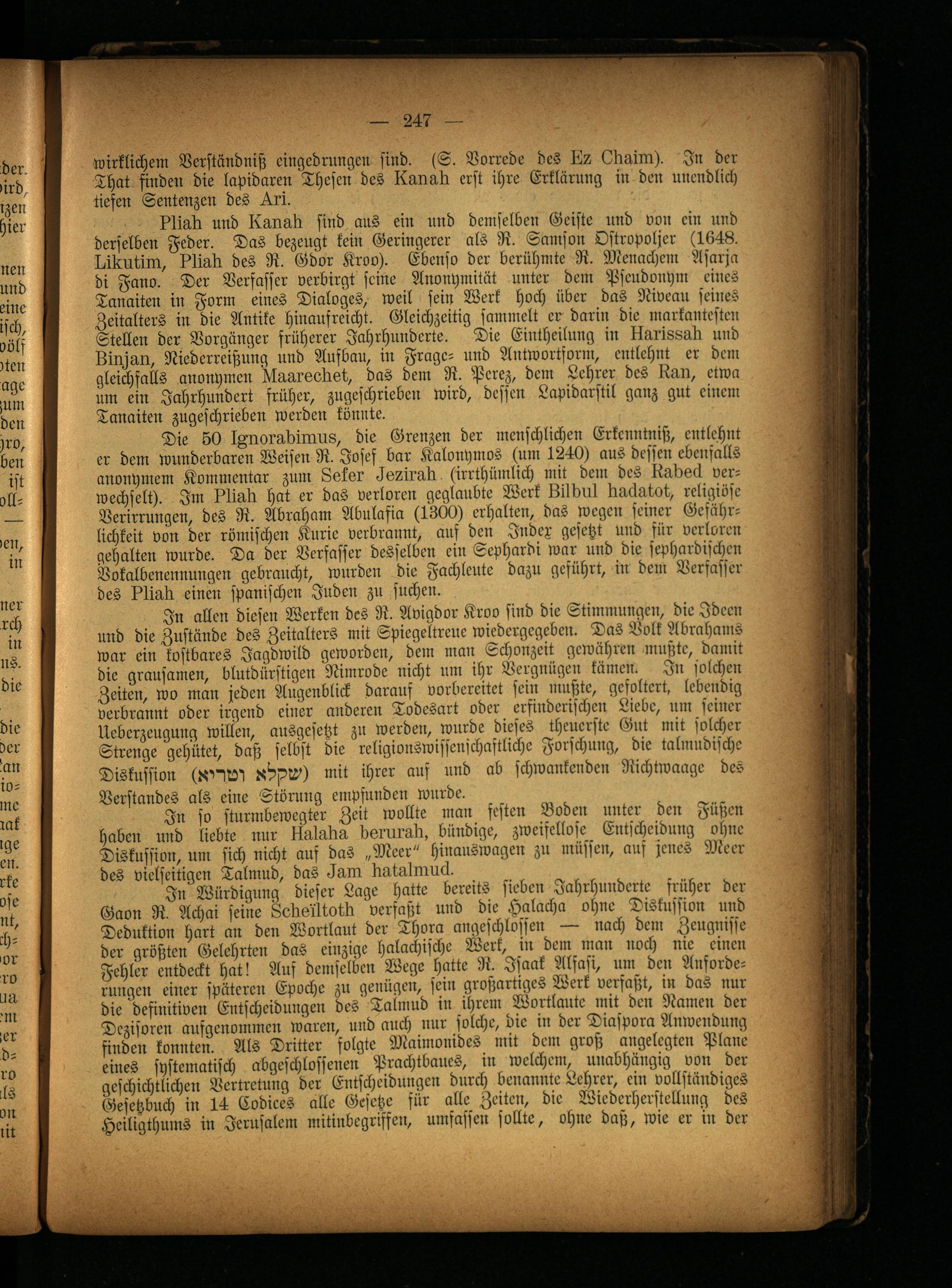 Die 50 IZnorsdiimis, die Grenzen der menschlichen Erkcnntniß, entlehnt er dem wunderbaren Weisen R. Josef bar Kalonymos (um 1240) aus dessen ebenfalls anonymem Kommentar zum Lslsr -ia/irsii (irrthümlich mit dem des lisdad verwechselt). Im Illis.ii hat er das verloren geglaubte Werk kilbui iisästot, religiöse Verirrungen, des R. Abraham Abulafia (1300) erhalten, das wegen seiner Gefährlichkeit von der römischen Kurie verbrannt, auf den Index gesetzt und für verloren gehalten wurde. Da der Verfasser desselben ein Sephardi war und die sephardischcn Vokalbenennungen gebraucht, wurden die Fachleute dazu geführt, in dem Verfasser des illisii einen spanischen Juden zu suchen.