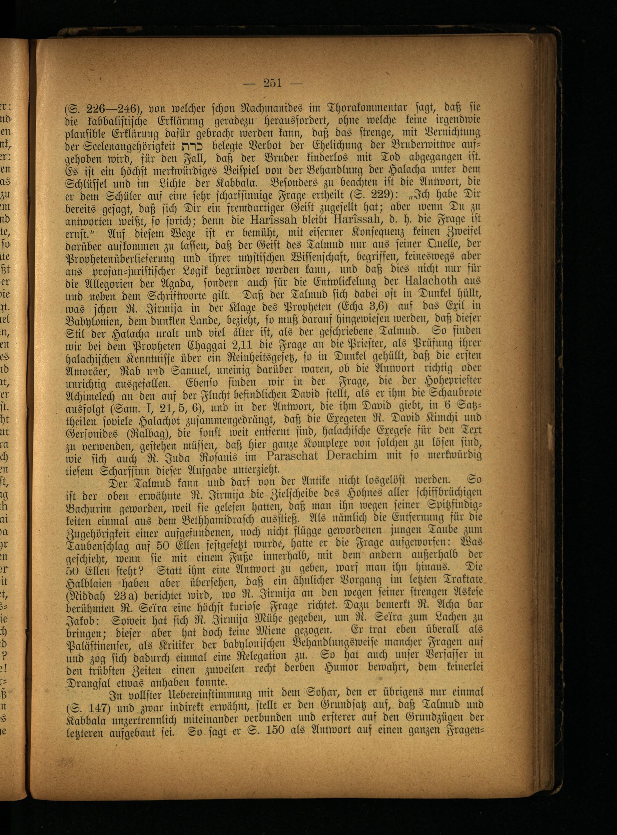 (S. 226—246), von welcher schon Nachmanides im Thorakommcutar sogt, daß sie die kabbalistische Erklärung geradezu herausfordert, ohne welche keine irgendwie plausible Erklärung dafür gebracht werden kann, daß das strenge, mit Vernichtung der Seelenangehörigkeit belegte Verbot der Ehelichung der Bruderwittwe ausgehoben wird, für den Fall, daß der Bruder kinderlos mit Tod abgegangen ist. Es ist ein höchst merkwürdiges Beispiel von der Behandlung der Halacha unter dem Schlüssel und im Lichte der Kabbala. Besonders zu beachten ist die Antwort, die er dem Schüler auf eine sehr scharfsinnige Frage ertheilt (S. 229): „Ich habe Dir bereits gesagt, daß sich Dir ein fremdartiger Geist zugesellt hat: aber wenn Dil zu antworten weißt, so sprich; denn die HM88g,d bleibt Hg.rwskld, d. h. die Frage ist ernst/' Auf diesem Wege ist er bemüht, mit eiserner Konsequenz keinen Zweifel darüber aufkommen zu lassen, daß der Geist des Talmud nur aus seiner Quelle, der Prophetenüberlieferung und ihrer mystischen Wissenschaft, begriffen, keineswegs aber aus profan-juristischer Logik begründet werden kann, und daß dies nicht nur für die Allegorien der Agada, sondern auch für die Entwlickeluug der Unlnellolii aus und neben dem Schriftworte gilt. Daß der Talmud sich dabei oft in Dunkel hüllt, was schon R. Jirmija in der Klage des Propheten (Echa 3,6) auf das Exil in Babylonien, dem dunklen Lande, bezieht, so muß darauf hingewiesen werden, daß dieser Stil der Halacha uralt und viel älter ist, als der geschriebene Talmud. So finden wir bei dem Propheten Chaggai 2,11 die Frage an die Priester, als Prüfung ihrer halachischen Kenntnisse über ein Reinheitsgesetz, so in Dunkel gehüllt, daß die ersten Amoräer, Rab und Samuel, uneinig darüber waren, ob die Antwort richtig oder unrichtig ausgefallen. Ebenso finden wir in der Frage, die der Hohepriester Achimelech an den auf der Flucht befindlichen David stellt, als er ihm die Schaubrote aussolgt (Sam. I, 21, 6, 6), und in der Antwort, die ihm David giebt, in 6 Satz- theilen soviele Halachot zusammengedrüngt, daß die Exegeten R. David Kimchi und Gersonides (Ralbag), die sonst weit entfernt sind, halachische Exegese für den Text zu verwenden, gestehen müssen, daß hier ganze Komplexe von solchen zu losen sind, wie sich auch R. Juda Roprnis im ?nr9,8ellnt Qaruakim mit so merkwürdig tiefem Scharfsinn dieser Aufgabe unterzieht.