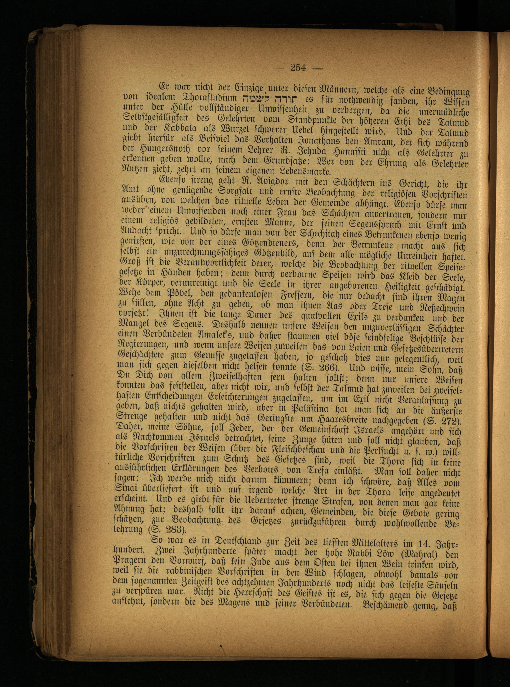 Mangel des Segens. Deshalb nennen unsere Weisen den unzuverlässigen Schächter einen Verbündeten Amalek's, und daher stammen viel böse feindselige Beschlüsse der Regierungen, und wenn unsere Weisen zuweilen das von Laien und Oesetzesübertretern Geschachtete zum Genüsse zugclassen haben, so geschah dies nur gelegentlich, weil man sich gegen dieselben nicht Helsen konnte (S. 266). Und wisse, mein Sohn, daß Du Dich von allem Zweifelhaften fern halten sollst; denn nur unsere Weisen konnten das feststellen, aber nicht wir, und selbst der Talmud hat zuweilen bei zweifelhafter: Entscheidungen Erleichterungen zugelassen, um im Exil nicht Veranlassung zu geben, daß nichts gehalten wird, aber in Palästina hat inan sich an die äußerste Strenge gehalten und nicht das Geringste um Haaresbreite nachgegcben (S. 272). Daher, meine Söhne, soll Jeder, der der Gemeinschaft Israels angehört und sich als Nachkommen Israels betrachtet, seine Zunge hüten und soll nicht glauben, daß die Vorschriften der Weisen (über die Fleischbeschau und die Perlsucht u. s. w.) willkürliche Vorschriften zum Schutz des Gesetzes sind, weil die Thora sich in keine ausführlichen Erklärungen des Verbotes von Trefa einläßt. Man soll daher nicht sagen: Ich werde mich nicht darum kümmern; denn ich schwöre, daß Alles vom Sinai überliefert ist und auf irgend welche Art in der Thora leise angedeutet erscheint. Und cs giebt für die Uebertreter strenge Strafen, von denen man gar keine Ahnung hat; deshalb sollt ihr darauf achten, Gemeinden, die diese Gebote gering schätzen, zur Beobachtung des Gesetzes zurückzuführen durch wohlwollende Belehrung (S. 283).