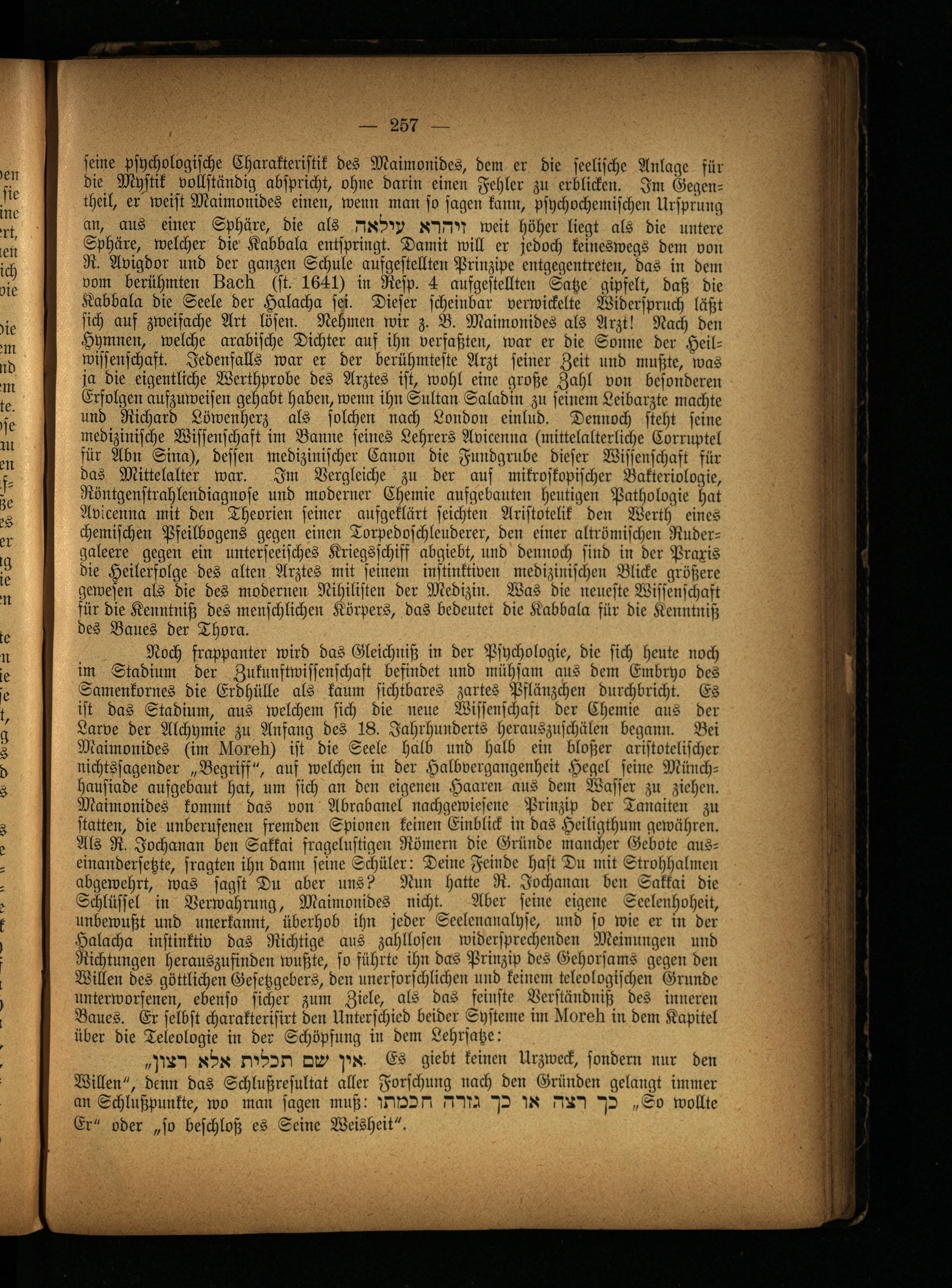 Röntgenstrahlendiagnose und moderner Chemie aufgebauten heutigen Pathologie hat Avicenna mit den Theorien seiner aufgeklärt seichten Aristotelik den Werth eines chemischen Pseilbogens gegen einen Torpedoschleuderer, den einer altrömischen Rudergaleere gegen ein unterseeisches Kriegsschiff abgiebt, und dennoch sind in der Praxis die Heilerfolge des alten Arztes mit seinem instinktiven medizinischen Blicke größere gewesen als die des modernen Nihilisten der Medizin. Was die neueste Wissenschaft für die Kenntniß des menschlichen Körpers, das bedeutet die Kabbala für die Kenntnis; des Baues der Thora.