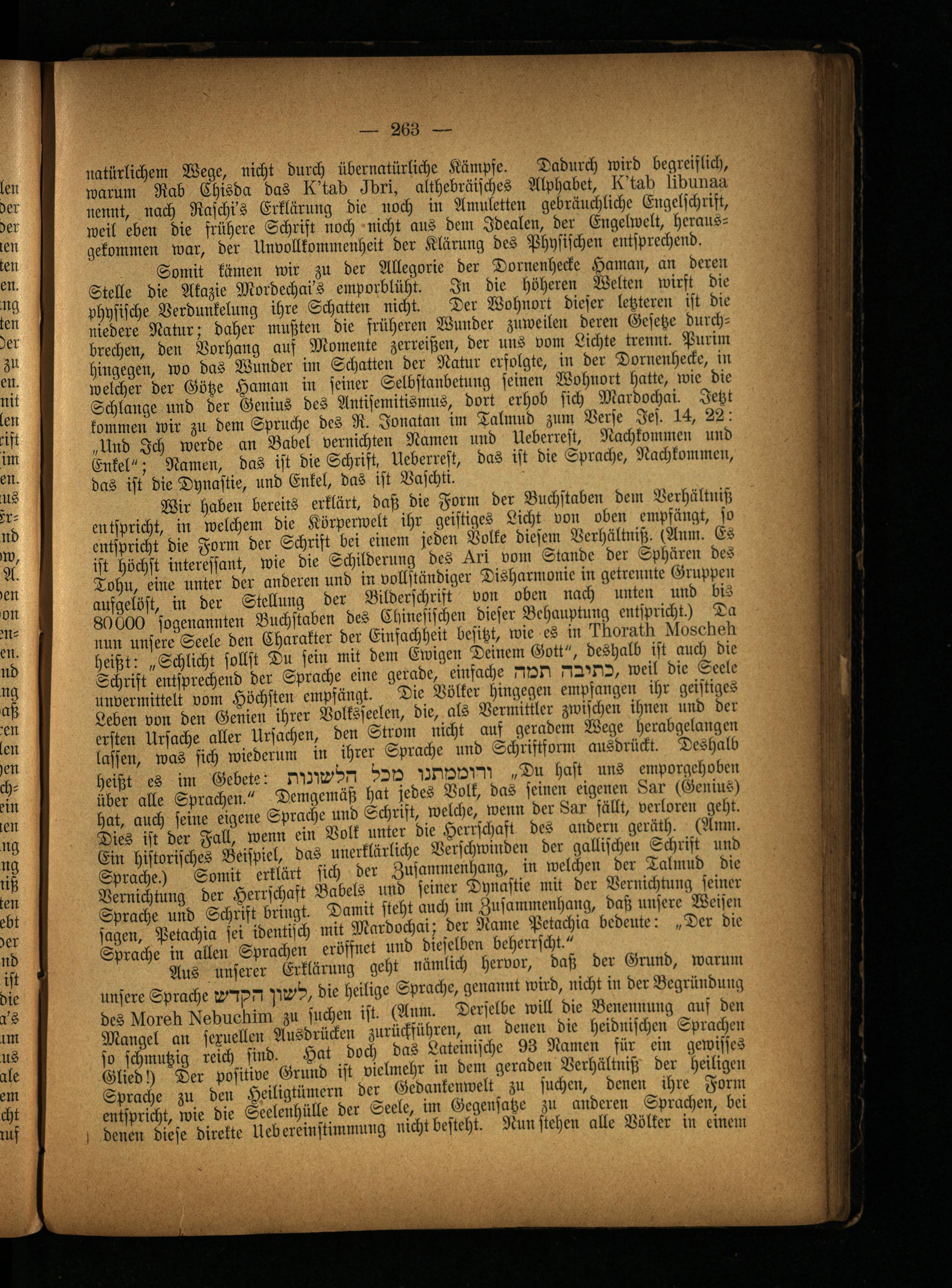 niedere Natur; daher mußten die früheren Wunder zuweilen deren Gesetze durchbrechen, den Vorhang auf Momente zerreißen, der uns vom Lichte trennt. Purim hingegen, wo das Wunder im Schatten der Natur erfolgte, in der Dornenhecke, in welcher der Götze Haman in feiner Selbstanbetung seinen Wohnort hatte, wie die Schlange und der Genius des Antisemitismus, dort erhob sich Mardochai. Jetzt kommen wir zu dem Spruche des R. Jonatan im Talmud zum Verse Jes. 14, 22: „Und Ich werde an Babel vernichten Namen und Ueberrest, Nachkommen und Enkel"; Namen, das ist die Schrift, Ueberrest, das ist die Sprache, Nachkommen, das ist die Dynastie, und Enkel, das ist Vaschti.