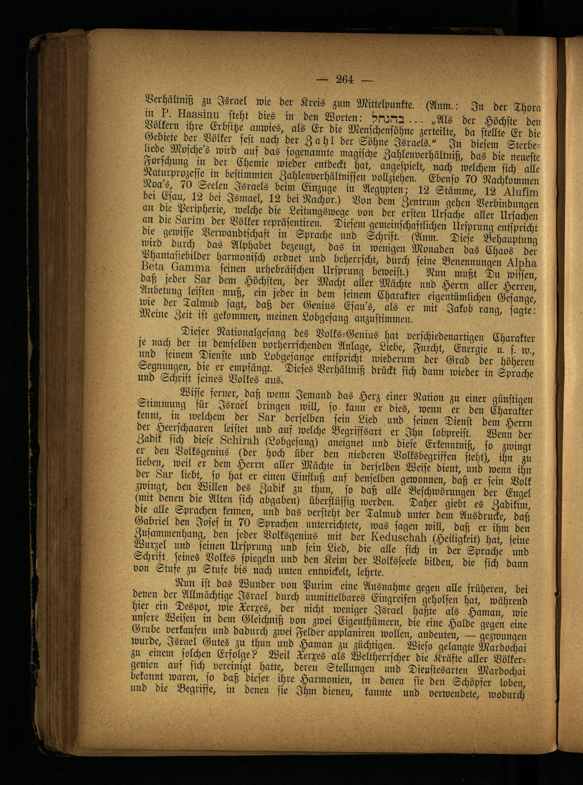 er den Volksgenius (der hoch über den niederen Volksbegriffen steht), ihn zu lieben, weil er dem Herrn aller Mächte in derselben Weise dient, und wenn ihn der 8ar liebt, so hat er einen Einfluß auf denselben gewonnen, daß er sein Volk zwingt, den Willen des Zadik zu thun, so daß alle Beschwörungen der Engel (mit denen die Alten sich abgaben) überflüssig werden. Daher giebt es Zadikim, die alle Sprachen kennen, und das versteht der Talmud unter dem Ausdrucke, daß Gabriel den Josef in 70 Sprachen unterrichtete, was sagen will, daß er ihni den Zusammenhang, den jeder Volksgenius mit der Kkäusellnll (Heiligkeit) hat, seine Wurzel und seinen Ursprung und sein Lied, die alle sich in der Sprache und Schrift seines Volkes spiegeln und den Keim der Volksseele bilden, die sich dann von Stufe zu Stufe bis nach unten entwickelt, lehrte.