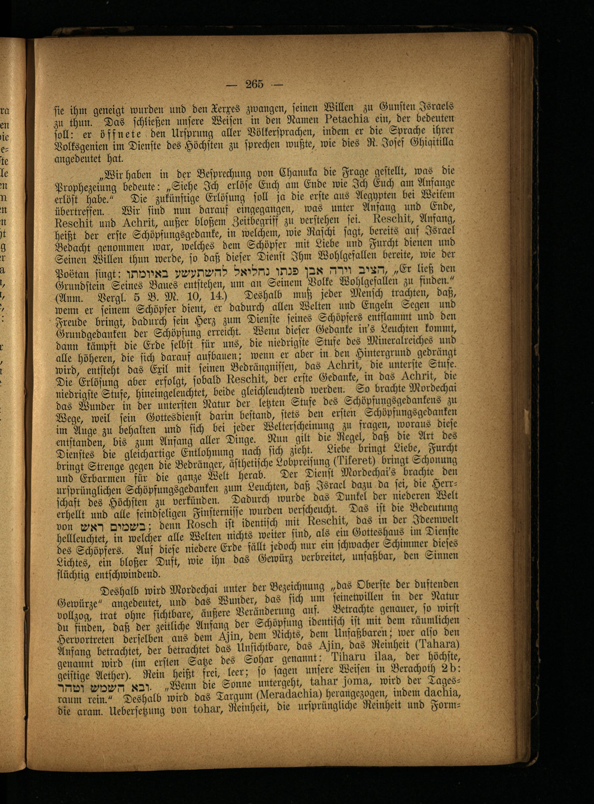 Deshalb wird Mordechai unter der Bezeichnung „das Oberste der duftenden Gewürze" angedeutet, und das Wunder, das sich um seinetwillen in der Natur vollzog, trat ohne sichtbare, äußere Veränderung auf. Betrachte genauer, so wirst du finden, daß der zeitliche Anfang der Schöpfung identisch ist mit dem räumlichen Hervortreten derselben aus dem IM, dem Nichts, dem Unfaßbaren; wer also den Anfang betrachtet, der betrachtet das Unsichtbare, das Mn, das Reinheit (4g.Kura) genannt wird (im ersten Satze des Sohar genannt: llststg.ru ilgg, der höchste, geistige Aether). Rein heißt frei, leer; so sagen unsere Weisen in Berachoth 2st: 2NV1 X21. „Wenn die Sonne untergeht, tastgr joing, wird der Tages