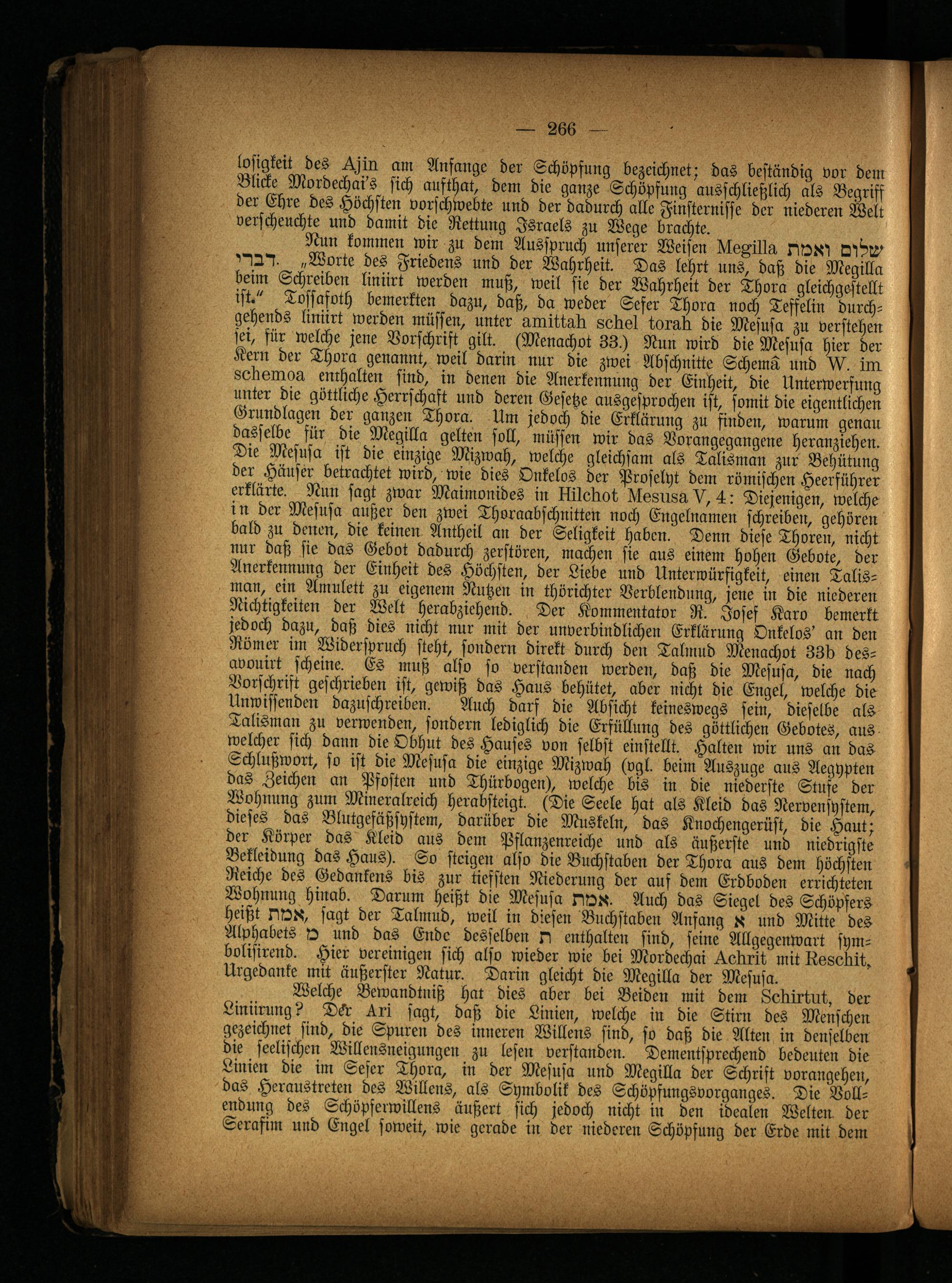 „Worte des Friedens und der Wahrheit. Das lehrt uns, daß die Megilla beim Schreiben liniirt werden muß, weil sie der Wahrheit der Thora gleichgestellt ist." Tossafoth bemerkten dazu, daß, da weder Sefer Thora noch Teffelin durch- gehends liniirt werden müssen, unter uniittuk sekal toruk die Mesusa zu verstehen sei, für welche jene Vorschrift gilt. (Menachot 33.) Nun wird die Mesusa hier der Kern der Thora genannt, weil darin nur die zwei Abschnitte Schema und VV. im soksinou enrhalten sind, in denen die Anerkennung der Einheit, die Unterwerfung unter die göttliche Herrschaft und deren Gesetze ausgesprochen ist, somit die eigentlichen Grundlagen der ganzen Thora. Um jedoch die Erklärung zu finden, warum genau dasselbe für die Megilla gelten soll, müssen wir das Vorangegangene heranziehen. Die Mesusa ist die einzige Mizwah, welche gleichsam als Talisman zur Behütung der Häuser betrachtet wird, wie dies Onkelos der Proselyt dem römischen Heerführer erklärte. Nun sagt zwar Maimonides in Mokot ülvsiwu V, 4: Diejenigen, welche in der Mesusa außer den zwei Thoraabschnitten noch Engelnamen schreiben, gehören bald zu denen, die keinen Antheil an der Seligkeit haben. Denn diese Thoren, nicht nur daß sie das Gebot dadurch zerstören, machen sie aus einem hohen Gebote, der Anerkennung der Einheit des Höchsten, der Liebe und Unterwürfigkeit, einen Talisman, ein Amulett zu eigenem Nutzen in thörichter Verblendung, jene in die niederen Nichtigkeiten der Welt herabziehend. Der Kommentator R. Josef Karo bemerkt jedoch dazu, daß dies nicht nur mit der unverbindlichen Erklärung Onkelos' an den Römer im Widerspruch steht, sondern direkt durch den Talmud Menachot 33k des- avouirt scheine. Es muß also so verstanden werden, daß die Mesusa, die nach Vorschrift geschrieben ist, gewiß das Haus behütet, aber nicht die Engel, welche die Unwissenden dazuschreiben. Auch darf die Absicht keineswegs sein, dieselbe als Talisman zu verwenden, sondern lediglich die Erfüllung des göttlichen Gebotes, aus welcher sich dann die Obhut des Hauses von selbst einstellt. Halten wir uns an das Schlußwort, so ist die Mesusa die einzige Mizwah (vgl. beim Auszuge aus Aegypten das Zeichen an Pfosten und Thürbogen), welche bis in die niederste Stufe der Wohnung zum Mineralreich herabsteigt. (Die Seele hat als Kleid das Nervensystem, dieses das Blutgefäßsystem, darüber die Muskeln, das Knochengerüst, die Haut; der Körper das Kleid aus dem Pflanzenreiche und als äußerste und niedrigste Bekleidung das Haus). So steigen also die Buchstaben der Thora aus dem höchsten Reiche des Gedankens bis zur tiefsten Niederung der auf dem Erdboden errichteten Wohnung hinab. Darum heißt die Mesusa NQX- Auch das Siegel des Schöpfers heißt sagt der Talmud, weil in diesen Buchstaben Anfang X und Mitte des Alphabets Q und das Ende desselben O enthalten sind, seine Allgegenwart sym- bolisirend. Hier vereinigen sich also wieder wie bei Mordechai ^.ekrit mit lis86kit, Urgedanke mit äußerster Natur. Darin gleicht die Megilla der Mesusa.