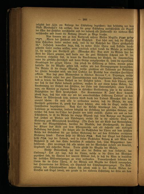 Welche Bewandtniß hat dies aber bei Beiden mit dem Lokirtut, der Liniirung? DSr üri sagt, daß die Linien, welche in die Stirn des Menschen gezeichnet sind, die Spuren des inneren Willens sind, so daß die Alten in denselben die seelischen Willensneigungen zu lesen verstanden. Dementsprechend bedeuten die Linien die im Sefer Thora, in der Mesusa und Megilla der Schrift vorangehen, das Heraustreten des Willens, als Symbolik des Schöpfungsvorganges. Die Vollendung des Schöpferwillens äußert sich jedoch nicht in den idealen Welten der Serafim und Engel soweit, wie gerade in der niederen Schöpfung der Erde mit dem