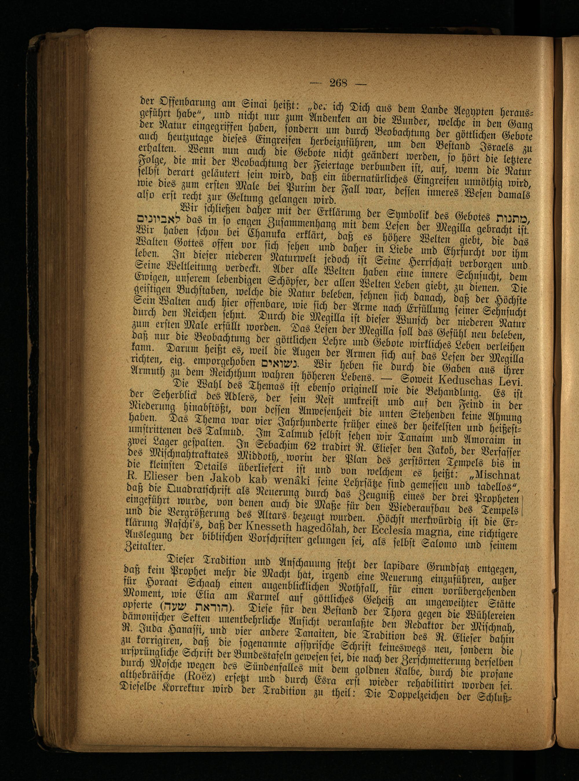 Wir schließen daher mit der Erklärung der Symbolik des Gebotes das in so engen Zusammenhang mit dem Lesen der Megilla gebracht ist. Wir haben schon bei Chanuka erklärt, daß es höhere Welten giebt, die das Walten Gottes offen vor sich sehen und daher in Liebe und Ehrfurcht vor ihm leben. In dieser niederen Natnrwelt jedoch ist Seine Herrschaft verborgen und Seine Weltleitung verdeckt. Aber alle Welten haben eine innere Sehnsucht, dem Ewigen, unserem lebendigen Schöpfer, der allen Welten Leben giebt, zu dienen. Die geistigen Buchstaben, welche die Natur beleben, sehnen sich danach, daß der Höchste Sein Walten auch hier offenbare, wie sich der Arme nach Erfüllung seiner Sehnsucht durch den Reichen sehnt. Durch die Megilla ist dieser Wunsch der niederen Natur zum ersten Male erfüllt worden. Das Lesen der Megilla soll das Gefühl neu beleben, daß nur die Beobachtung der göttlichen Lehre und Gebote wirkliches Leben verleihen kann. Darum heißt es, weil die Augen der Armen sich auf das Lesen der Megilla richten, eig. emporgehoben Wir heben sie durch die Gaben aus ihrer
