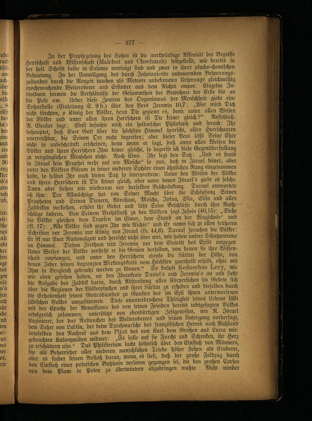 In der Prophezeiung des Sohar ist die merkwürdige Affinität der Begriffe Herrschaft^und Wissenschaft (üluledut und Olioollmull) fcstgcstcllt, wie bereits in der heil. Schrift beide in Salomo vereinigt sind und zwar in ihrer psycho-chemischen Bedeutung. In der Umwälzung des durch Jahrtausende andauernden Beharrungs- zustandes durch die Neuzeit tauchen als Meteore unbekannten Ursprungs gleichmäßig epochemachende Welteroberer und Erfinder aus dem Nichts empor. Einzelne Individuen formen die Verhältnisse der Gesammtheit der Bewohner der Erde bis an die Pole um. Ueber diese Zentren des Organismus der Menschheit gicbt eine Soharstelle (Einleitung S. 9 b.) über den Vers Jeremia 10,7: „Wer wird Dich nicht furchten, o König der Völker, denn Dir geziemt es, denn unter allen Weisen der Völker und unter allen ihren Herrschern ist Dir keiner gleich?" Aufschluß: R. Eleasar sagt: Einst besuchte mich ein heidnischer Philosoph und sprach: Ihr behauptet, daß Euer Gott über die höchsten Himmel herrscht, allen Heerschaaren unerreichbar, die Seinen Ort nicht begreifen; aber dieser Vers läßt Seine Ehre nicht so unbeschränkt erscheinen, denn wenn er sagt, daß unter allen Weisen der Völker und ihren Herrschern Ihm keiner gleiche, so begreife ich diese Gegenüberstellung zu vergänglichen Menschen nicht. Noch Eins. Ihr legt den Satz: „Und es stand in Israel kein Prophet mehr auf wie Mosche" so aus, daß in Israel keiner, aber unter den Völkern Bileam in seiner niederen Sphäre einen ähnlichen Bang eingenommen habe, so solltet Ihr auch diesen Satz so interpretiren: Unter den Weisen der Völker und ihren Herrschern ist Dir keiner gleich, aber unter denen Jsrael's giebt es solche. Dann aber stehen wir wiederum vor derselben Beschränkung. Daraus antwortete ich ihm: Der Allmächtige hat von Seiner Macht über die Schöpfung Seinen Propheten und Seinen Dienern, Abraham, Mosche, Josna, Elia, Elisa und allen Zaddikim verliehen, erhört ihr Gebet und läßt Seine Beschlüsse durch ihre Rathschläge ändern. Von Seinem Verhältnis; zu den Völkern sagt Jesaia (40,15): „Siehe die Völker gleichen dein Tropfen im Eimer, dem Staub an der Wagschale" und (B. 17): „Me Völker sind gegen Ihn wie Nichts" und Er nennt sich in allen früheren Schriften vor Jeremia nur König von Israel (ib. 44,6). Darauf sprachen die Völker: Er ist nur Euer Nationalgott und herrscht nicht über uns, wir haben unsere Schutzpatrone im Himmel. Diesem Jrrthum tritt Jeremia vor dem Eintritt des Exils entgegen. Unter Weisen der Völker versteht er die Genien derselben, von denen sic ihre Wissenschaft empfangen, und unter den Herrschern ebenso die Lnrim der Höhe, von denen Jeder seinen begrenzten Wirkungskreis vom Höchsten zuertheilt erhält, ohne mit Ihm in Vergleich gebracht werden zu können." So knüpft Ueäusollus I.evv, wie wir oben gesehen haben, an den Jdeenkreis Daniels und Jeremias an und sieht die Aufgabe des Zaddik darin, durch Abstreifung alles Körperlichen im Gebete sich über die Regionen der Völkerpspchen und ihrer Lnrim zn erheben und dieselben durch die Erhabenheit seines Gottesdienstes zu Gunsten des im Exil ihnen unterworscnen jüdischen Volkes umzustimmen. Diese ununterbrochene Thätigkeit seines Gebens fällt mit der Epoche der Renaissance des von seinen Feinden bereits todtgesagten Volkes erfolgreich zusammen, unterstützt von ebenbürtigen Zeitgenossen, wie R. Israel Koziniecer, der das Anstauchen des Welteroberers und seinen Untergang vorhersagt, dem Seher von Lublin, der beim Durchmärsche des französischen Heeres »ach Rußland vemselben den Nachruf aus dem ?iM des von Karl dem Großen aus Lucca mitgebrachten Kalonymiden widmet: „Es falle auf sie Furcht und Schrecken, ihr Herz zu erschüttern usw." Das Philistertum lacht höhnisch über den Einfluß von Männern, die als Beherrscher aller niederen menschlichen Triebe höher stehen als Eroberer, ober es findet keinen Anstoß daran, wenn es liest, daß der große Feldzug durch den Einfluß einer polnischen Buhlerin verloren gegangen sei, die den großen Corsen von dem Plane in Polen zu überwintern abzubringen wußte. Nicht minder